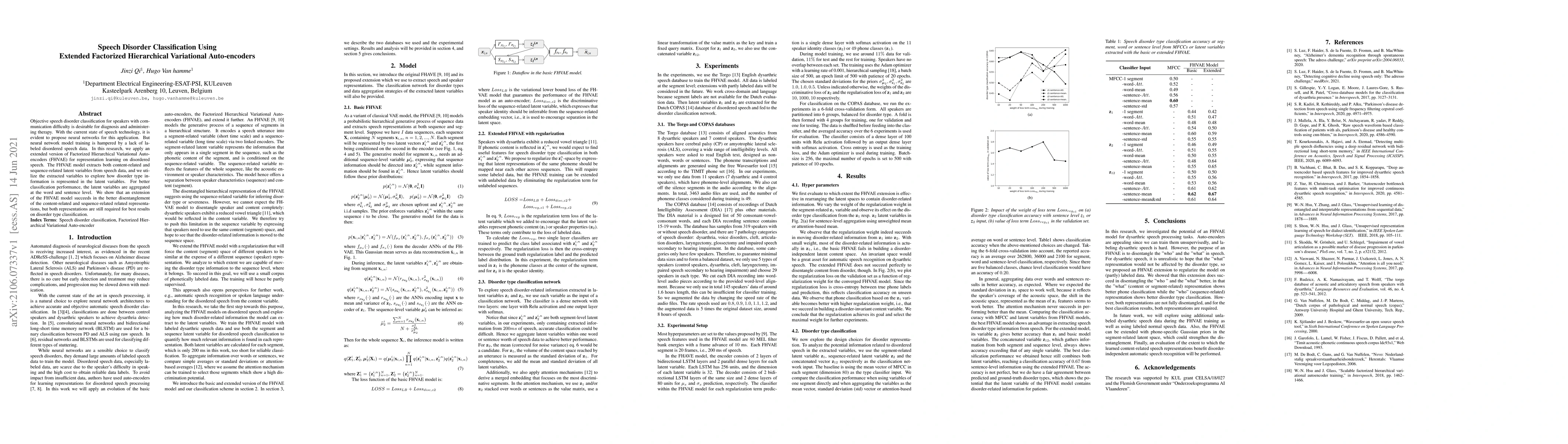 This paper proposes an extended Factorized Hierarchical Variational Auto-encoder (FHVAE) for classifying speech disorders by learning latent representations from disordered speech data. The model disentangles content-related and sequence-related features, achieving better classification performance when both types of representations are aggregated at the word and sentence levels.