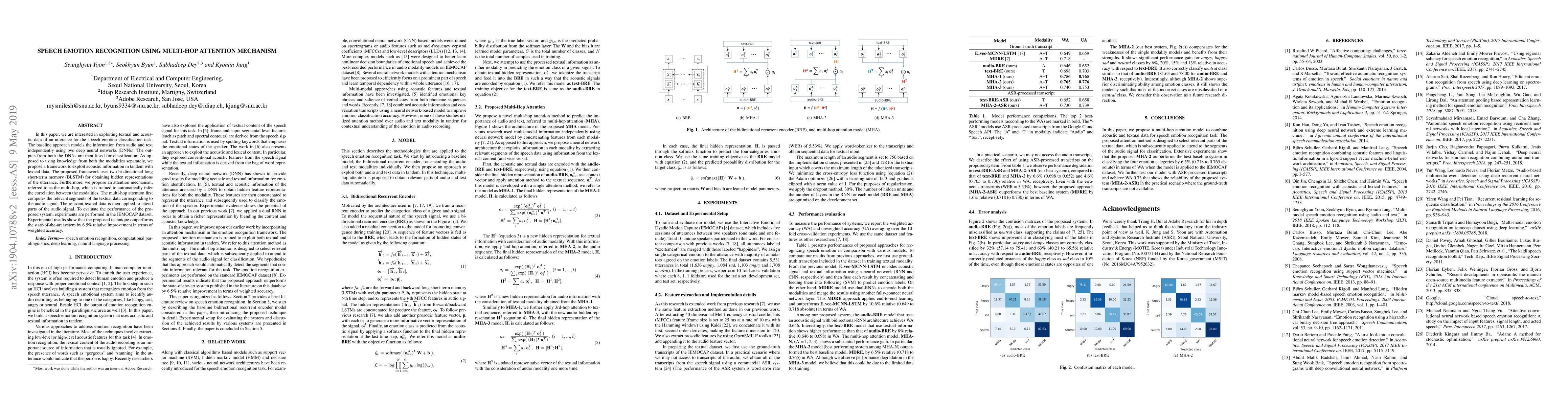 This paper proposes a multi-hop attention mechanism for speech emotion recognition, outperforming state-of-the-art systems by 6.5% in accuracy, by fusing acoustic and textual data in a novel way.