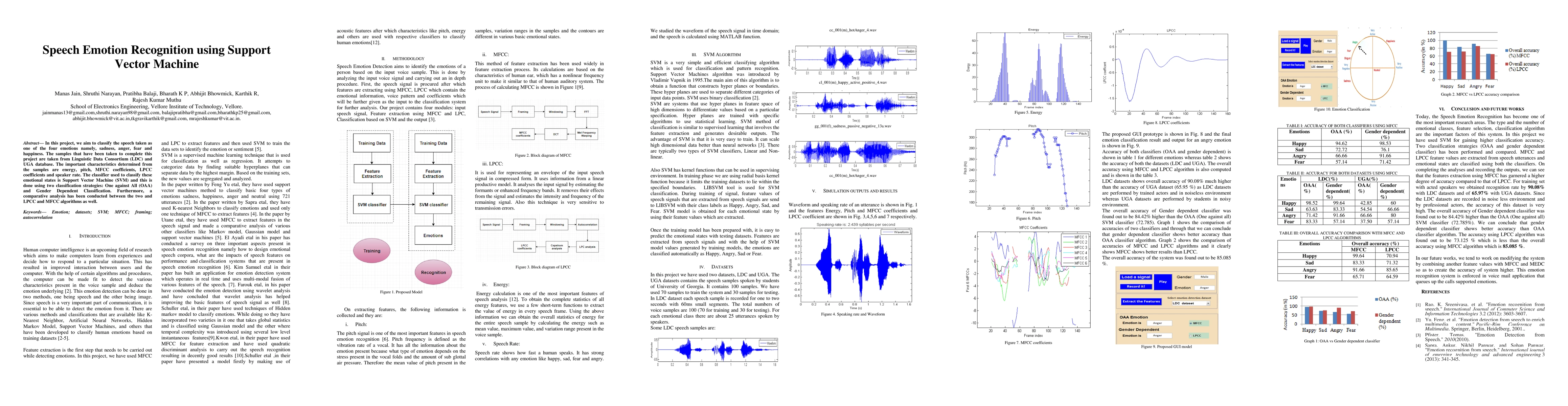 This research classifies speech into four emotions—sadness, anger, fear, and happiness—using Support Vector Machine (SVM) with features like energy, pitch, MFCC, and LPCC. It employs One against All and Gender Dependent classification strategies, and compares their performance.