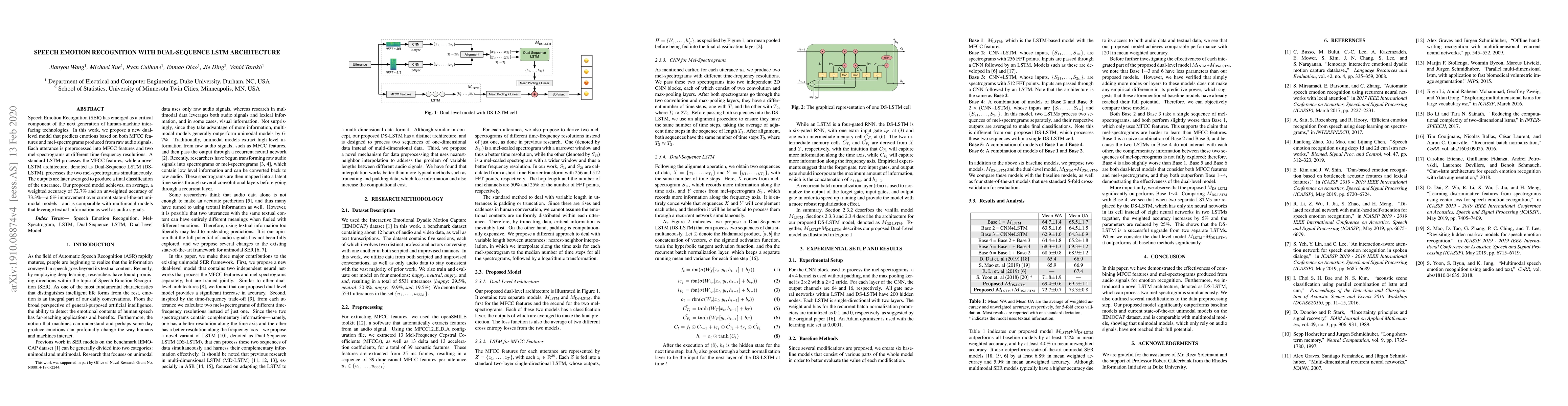 This paper proposes a dual-sequence LSTM architecture for Speech Emotion Recognition, combining MFCC features and mel-spectrograms processed by separate LSTMs, achieving a 6% improvement over unimodal models. The model attains a weighted accuracy of 72.7% and an unweighted accuracy of 73.3%.