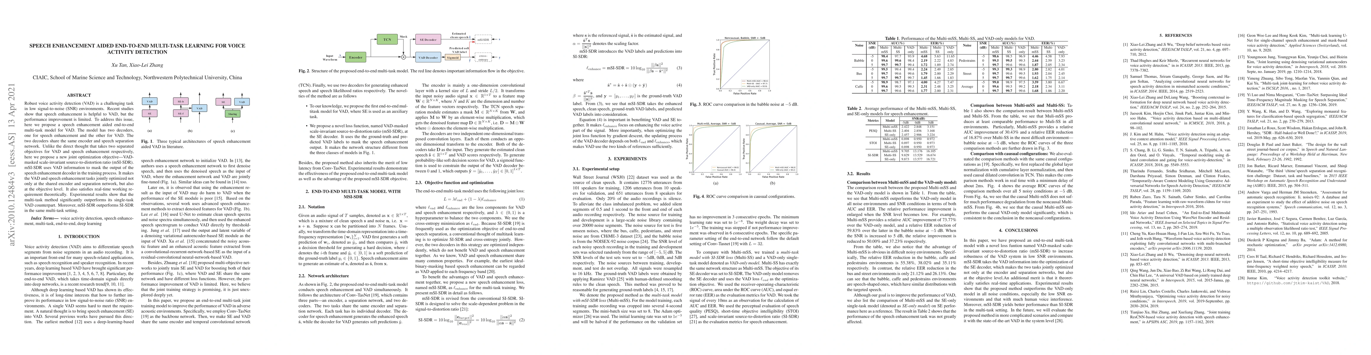 This paper proposes a speech enhancement aided end-to-end multi-task learning model for robust voice activity detection (VAD) in low SNR environments. The model jointly optimizes speech enhancement and VAD using a novel objective, VAD-masked scale-invariant source-to-distortion ratio (mSI-SDR), which outperforms traditional methods and satisfies real-time requirements.