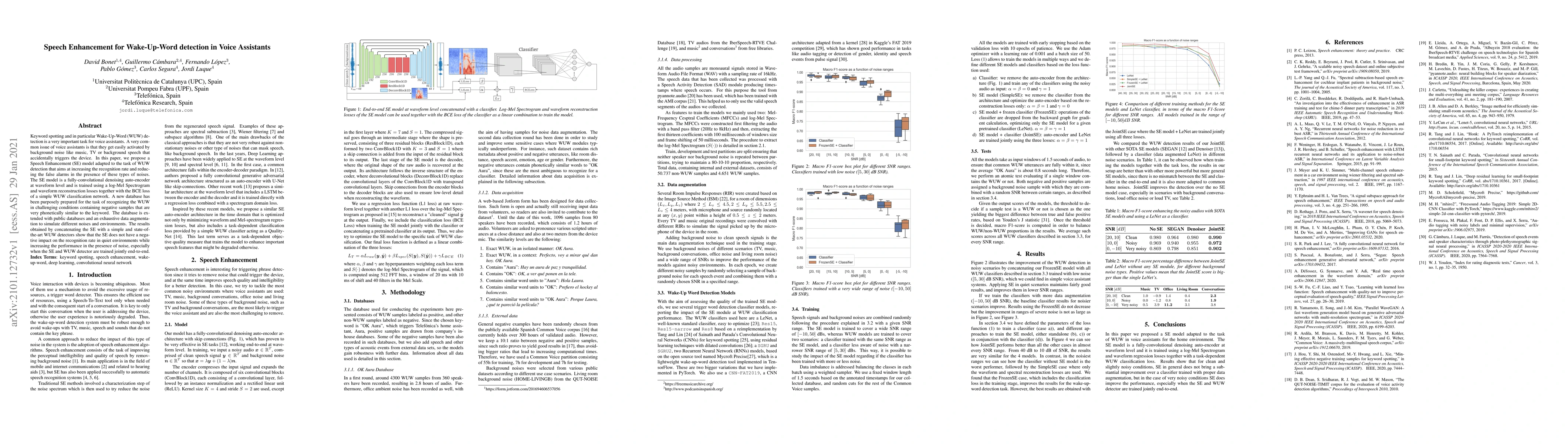 Keyword spotting and in particular Wake-Up-Word (WUW) detection is a very important task for voice assistants. A very common issue of voice assistants is that they get easily activated by background noise like music, TV or background speech that accidentally triggers the device. In this paper, we propose a Speech Enhancement (SE) model adapted to the task of WUW detection that aims at increasing the recognition rate and reducing the false alarms in the presence of these types of noises. The SE model is a fully-convolutional denoising auto-encoder at waveform level and is trained using a log-Mel Spectrogram and waveform reconstruction losses together with the BCE loss of a simple WUW classification network. A new database has been purposely prepared for the task of recognizing the WUW in challenging conditions containing negative samples that are very phonetically similar to the keyword. The database is extended with public databases and an exhaustive data augmentation to simulate different noises and environments. The results obtained by concatenating the SE with a simple and state-of-the-art WUW detectors show that the SE does not have a negative impact on the recognition rate in quiet environments while increasing the performance in the presence of noise, especially when the SE and WUW detector are trained jointly end-to-end.