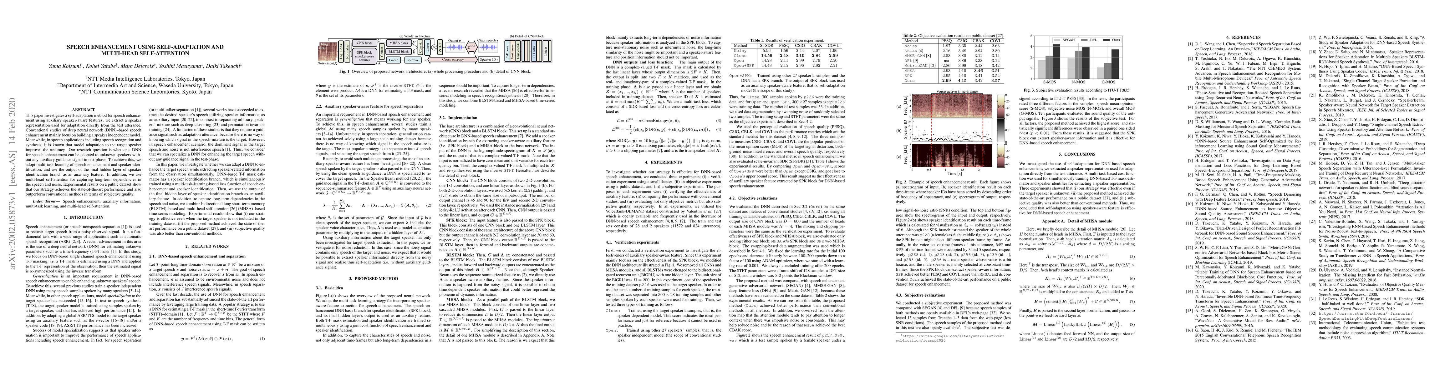 This paper proposes a self-adaptation method for speech enhancement using speaker-aware features extracted from the test utterance, achieving state-of-the-art performance through multi-task learning and multi-head self-attention for capturing long-term dependencies.
