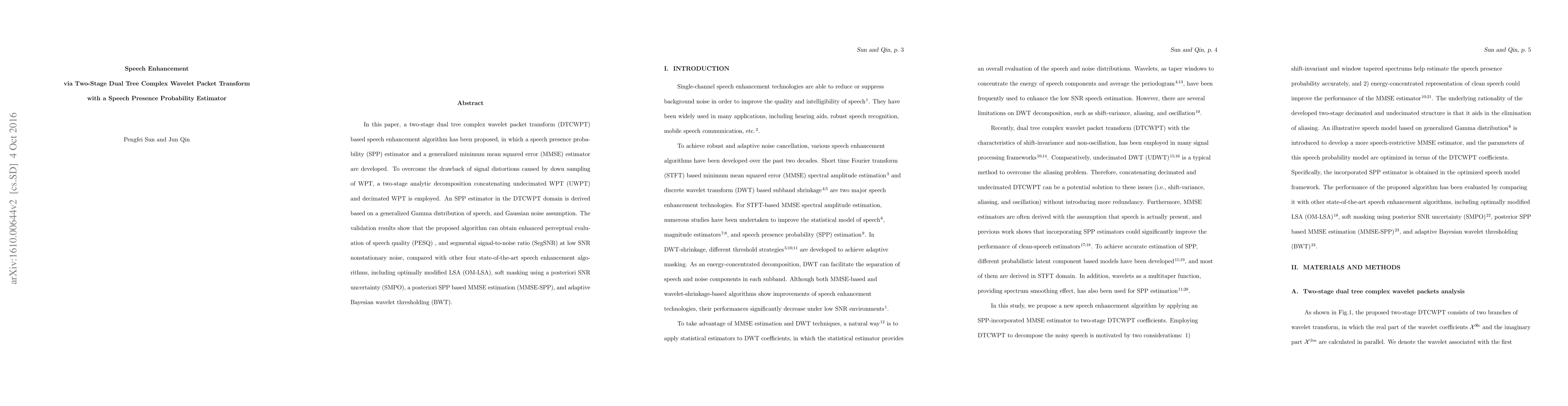 This paper proposes a two-stage dual tree complex wavelet packet transform (DTCWPT) for speech enhancement, incorporating a speech presence probability (SPP) estimator and a generalized MMSE estimator. The method combines undecimated and decimated WPT to mitigate signal distortion, achieving better perceptual evaluation and signal-to-noise ratio compared to other state-of-the-art algorithms.
