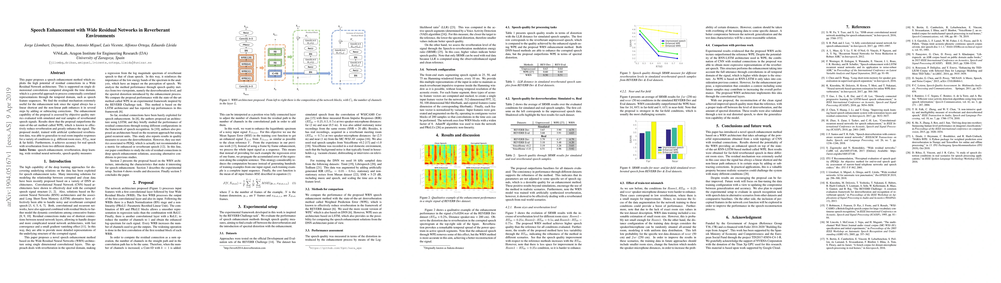 This paper introduces a speech enhancement method using Wide Residual Networks with residual connections, showing superior performance over the state-of-the-art WPE method in both simulated and real reverberated speech signals. The model effectively generalizes across different room conditions and datasets.
