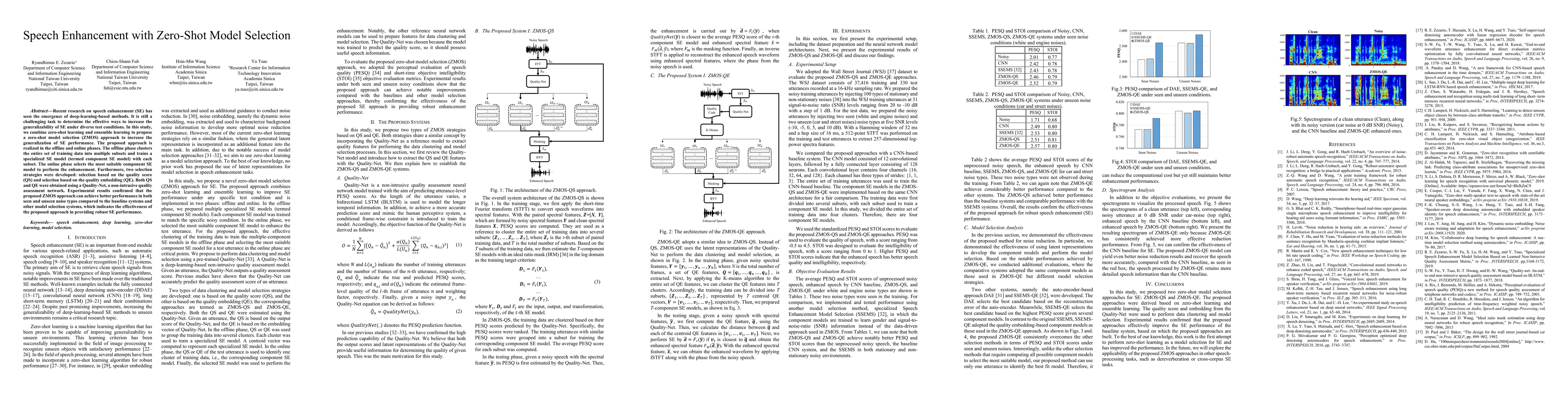 Recent research on speech enhancement (SE) has seen the emergence of deep-learning-based methods. It is still a challenging task to determine the effective ways to increase the generalizability of SE under diverse test conditions. In this study, we combine zero-shot learning and ensemble learning to propose a zero-shot model selection (ZMOS) approach to increase the generalization of SE performance. The proposed approach is realized in the offline and online phases. The offline phase clusters the entire set of training data into multiple subsets and trains a specialized SE model (termed component SE model) with each subset. The online phase selects the most suitable component SE model to perform the enhancement. Furthermore, two selection strategies were developed: selection based on the quality score (QS) and selection based on the quality embedding (QE). Both QS and QE were obtained using a Quality-Net, a non-intrusive quality assessment network. Experimental results confirmed that the proposed ZMOS approach can achieve better performance in both seen and unseen noise types compared to the baseline systems and other model selection systems, which indicates the effectiveness of the proposed approach in providing robust SE performance.