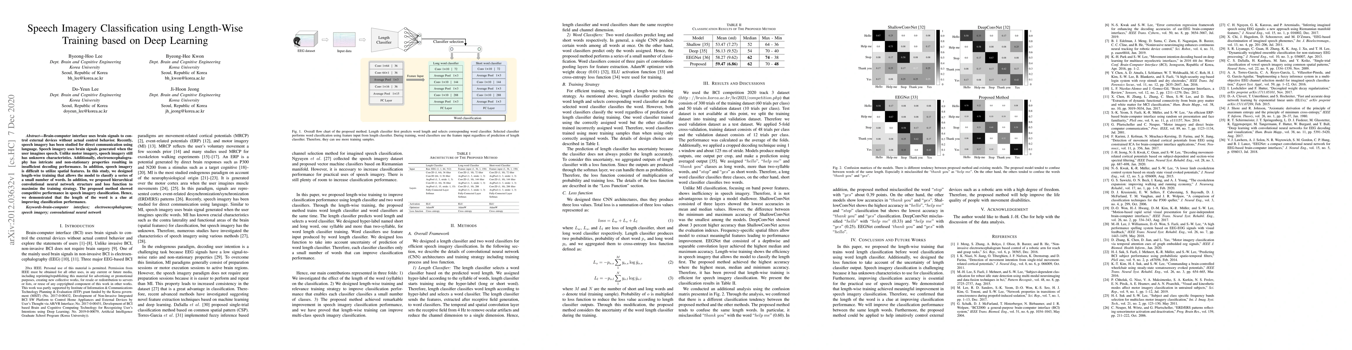 Brain-computer interface uses brain signals to control external devices without actual control behavior. Recently, speech imagery has been studied for direct communication using language. Speech imagery uses brain signals generated when the user imagines speech. Unlike motor imagery, speech imagery still has unknown characteristics. Additionally, electroencephalography has intricate and non-stationary properties resulting in insufficient decoding performance. In addition, speech imagery is difficult to utilize spatial features. In this study, we designed length-wise training that allows the model to classify a series of a small number of words. In addition, we proposed hierarchical convolutional neural network structure and loss function to maximize the training strategy. The proposed method showed competitive performance in speech imagery classification. Hence, we demonstrated that the length of the word is a clue at improving classification performance.