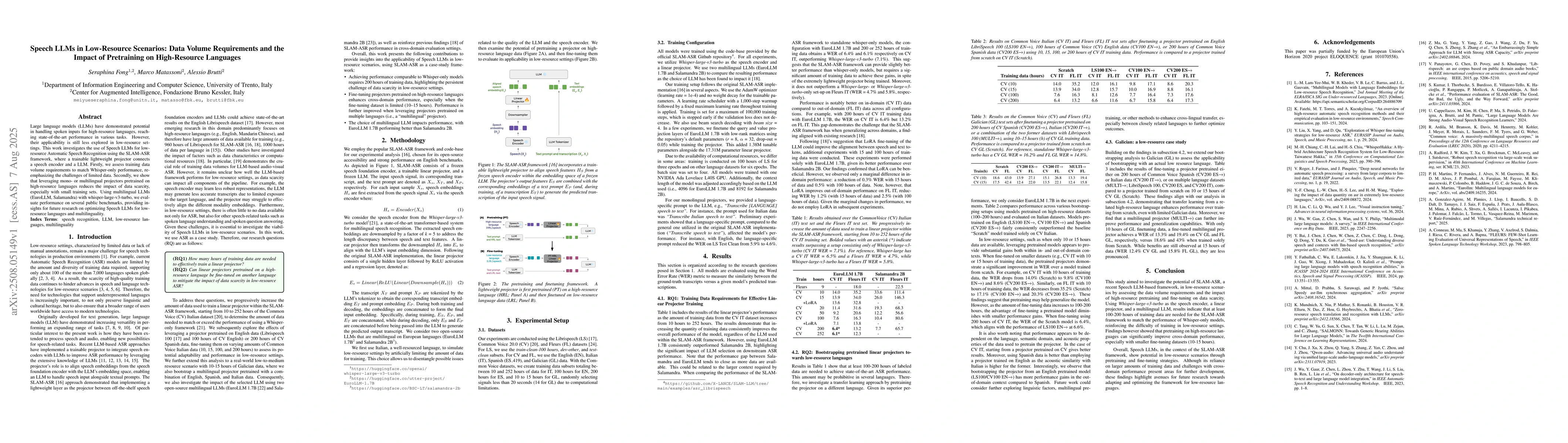 Large language models (LLMs) have demonstrated potential in handling spoken inputs for high-resource languages, reaching state-of-the-art performance in various tasks. However, their applicability is still less explored in low-resource settings. This work investigates the use of Speech LLMs for low-resource Automatic Speech Recognition using the SLAM-ASR framework, where a trainable lightweight projector connects a speech encoder and a LLM. Firstly, we assess training data volume requirements to match Whisper-only performance, re-emphasizing the challenges of limited data. Secondly, we show that leveraging mono- or multilingual projectors pretrained on high-resource languages reduces the impact of data scarcity, especially with small training sets. Using multilingual LLMs (EuroLLM, Salamandra) with whisper-large-v3-turbo, we evaluate performance on several public benchmarks, providing insights for future research on optimizing Speech LLMs for low-resource languages and multilinguality.