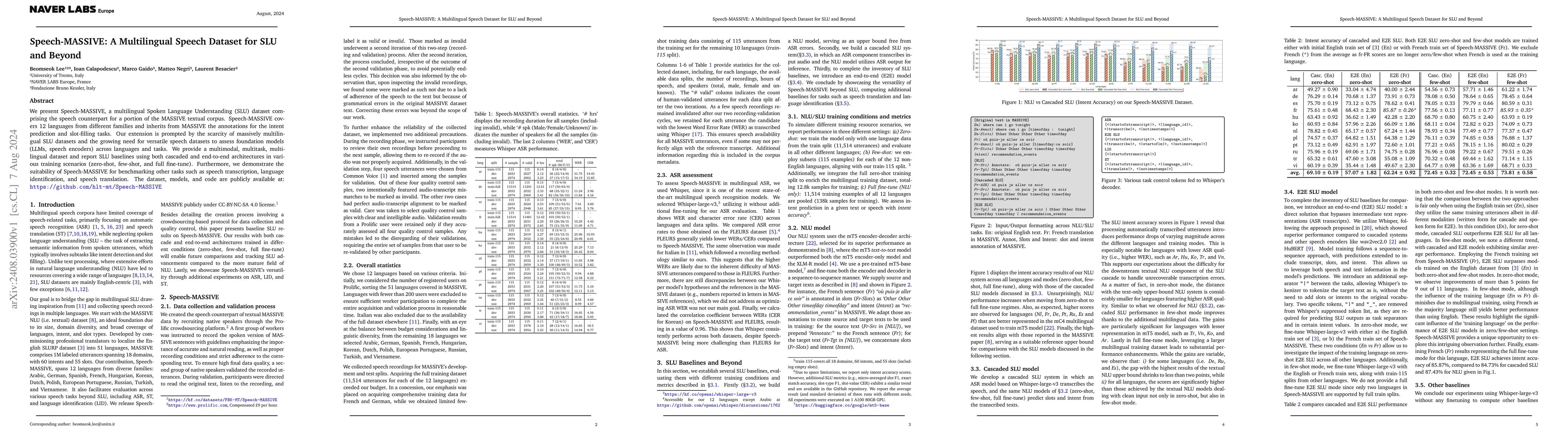 Speech-MASSIVE is a multilingual dataset for Spoken Language Understanding (SLU) covering 12 languages, derived from the MASSIVE textual corpus, and includes intent prediction and slot-filling annotations. The dataset aims to address the scarcity of large-scale multilingual SLU datasets and supports benchmarking for various speech tasks.