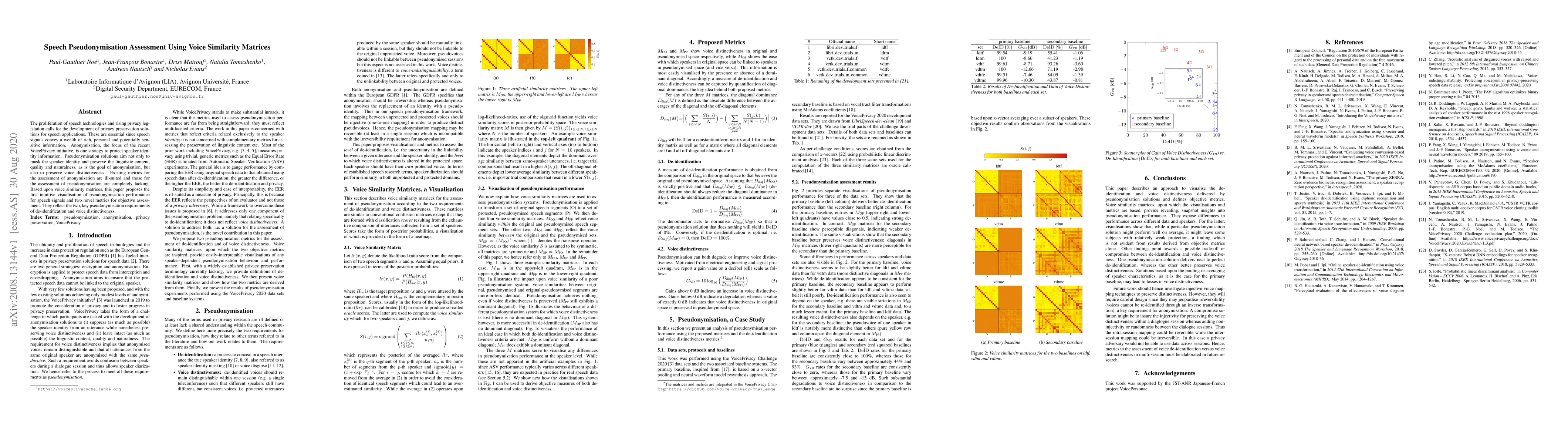 This paper introduces a novel approach to assess pseudonymisation in speech signals using voice similarity matrices, proposing two new metrics to evaluate both de-identification and voice distinctiveness, addressing the lack of existing tools for pseudonymisation assessment.