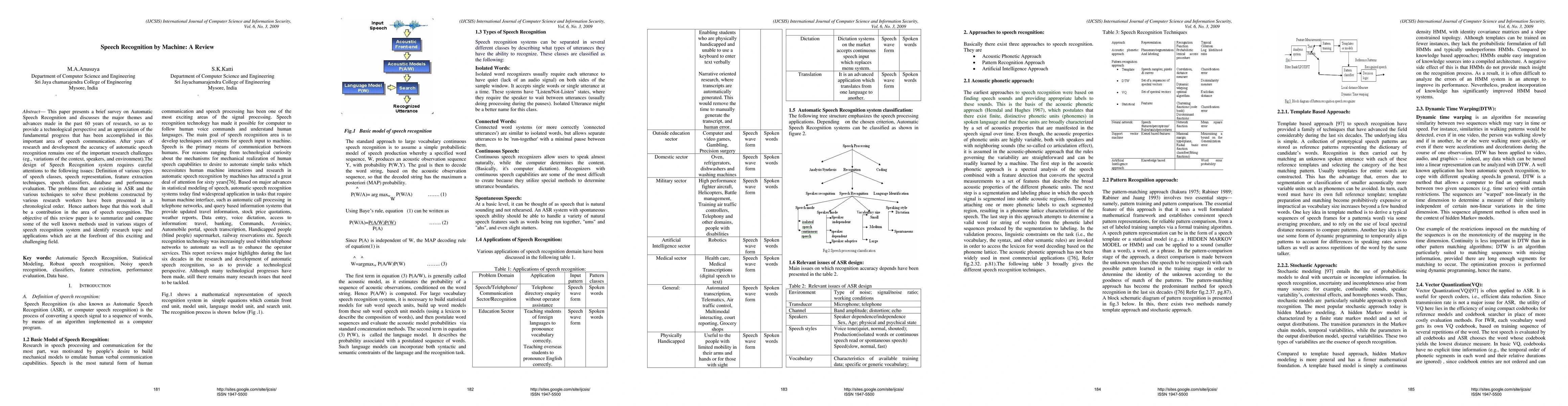 This paper presents a brief survey on Automatic Speech Recognition and discusses the major themes and advances made in the past 60 years of research, so as to provide a technological perspective and an appreciation of the fundamental progress that has been accomplished in this important area of speech communication. After years of research and development the accuracy of automatic speech recognition remains one of the important research challenges (e.g., variations of the context, speakers, and environment).The design of Speech Recognition system requires careful attentions to the following issues: Definition of various types of speech classes, speech representation, feature extraction techniques, speech classifiers, database and performance evaluation. The problems that are existing in ASR and the various techniques to solve these problems constructed by various research workers have been presented in a chronological order. Hence authors hope that this work shall be a contribution in the area of speech recognition. The objective of this review paper is to summarize and compare some of the well known methods used in various stages of speech recognition system and identify research topic and applications which are at the forefront of this exciting and challenging field.