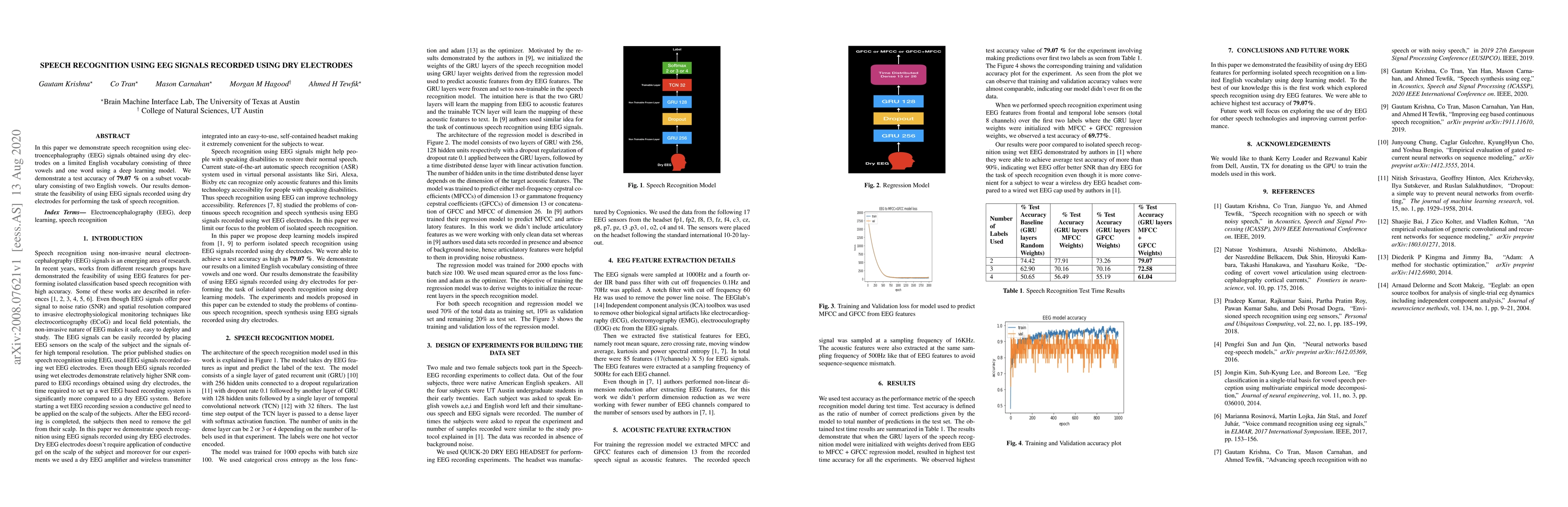 This paper explores speech recognition via EEG signals captured with dry electrodes, achieving 79.07% accuracy on a limited English vocabulary. The study demonstrates the potential of dry EEG electrodes for speech recognition tasks using deep learning models.