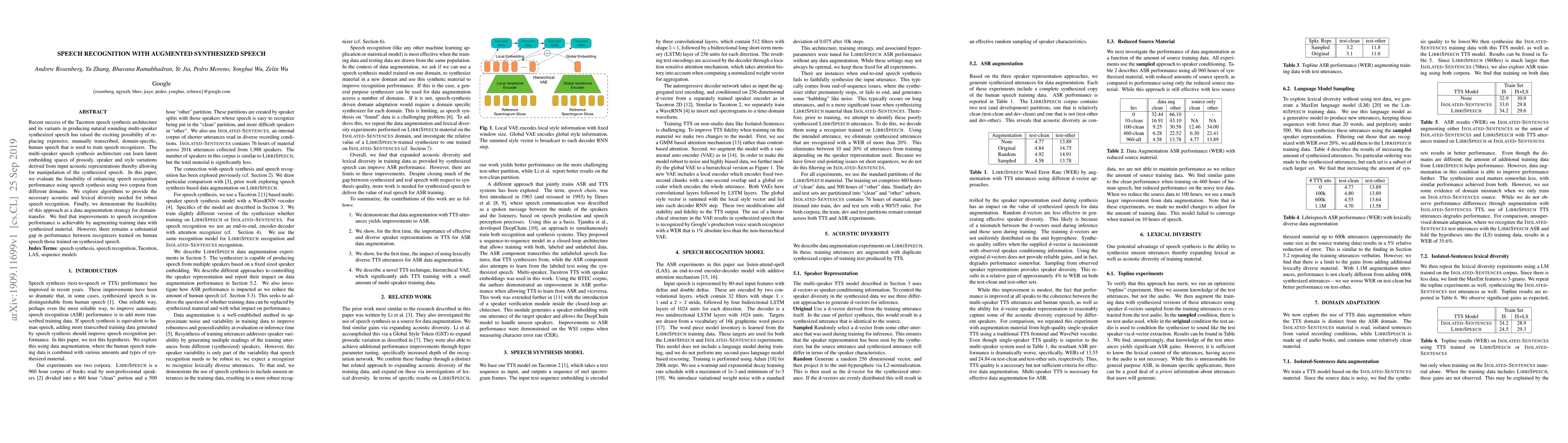 This paper investigates the potential of using augmented synthesized speech from Tacotron models to enhance speech recognition performance, demonstrating improvements when training data includes synthesized speech. However, it highlights a significant performance gap between recognizers trained on human versus synthesized speech, indicating room for further research.
