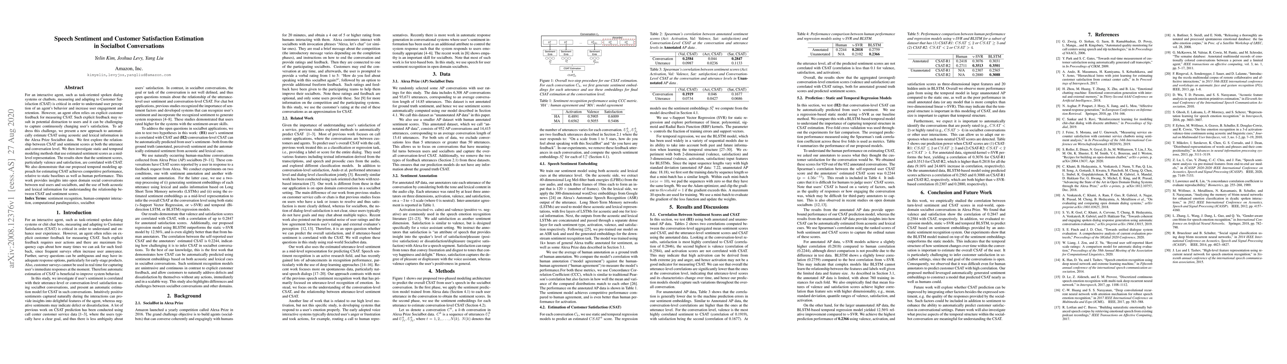 This paper proposes a method to estimate Customer Satisfaction (CSAT) in socialbot conversations using sentiment analysis of acoustic and lexical information. It finds that sentiment scores, particularly valence and satisfaction, correlate with CSAT and demonstrates that a temporal modeling approach can achieve competitive performance compared to static baselines and human judgments.
