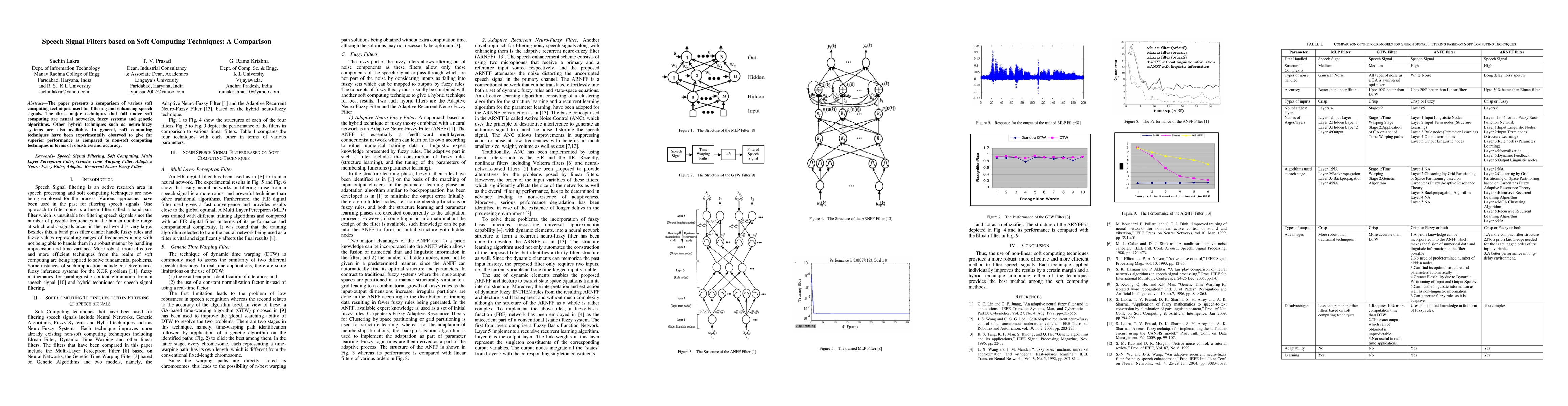 This paper compares the performance of neural networks, fuzzy systems, genetic algorithms, and hybrid neuro-fuzzy systems in filtering and enhancing speech signals, finding that soft computing techniques generally outperform traditional methods in robustness and accuracy.