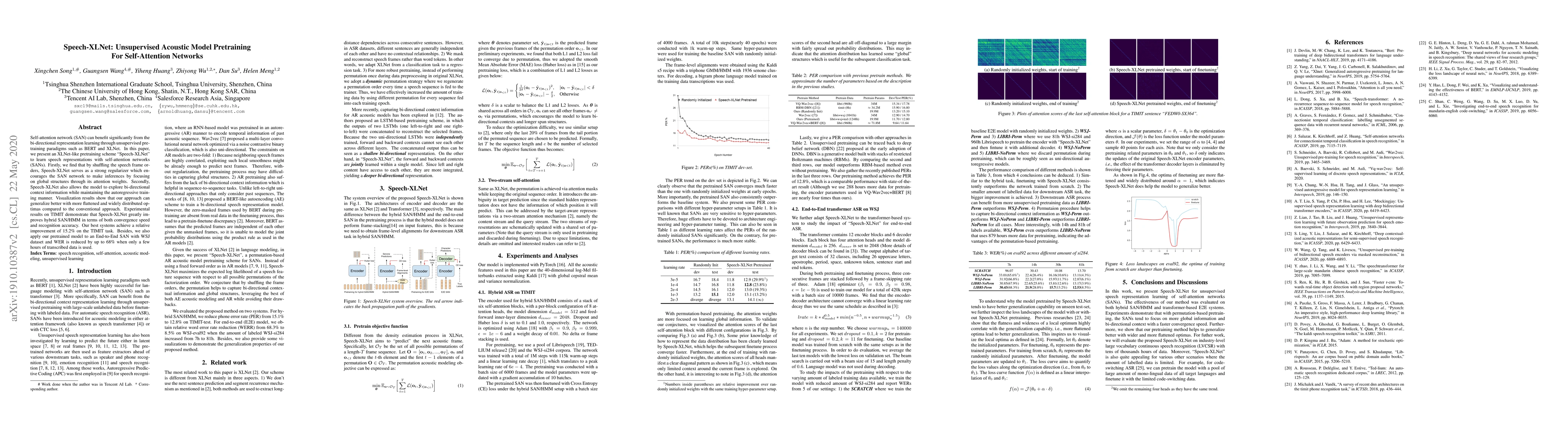Speech-XLNet introduces an unsupervised pretraining scheme for self-attention networks to enhance speech representation learning, achieving significant improvements in convergence speed and recognition accuracy on TIMIT and WSJ datasets. The method leverages bi-directional context and global structure inference through frame order shuffling, resulting in a notable reduction in phone error rates.