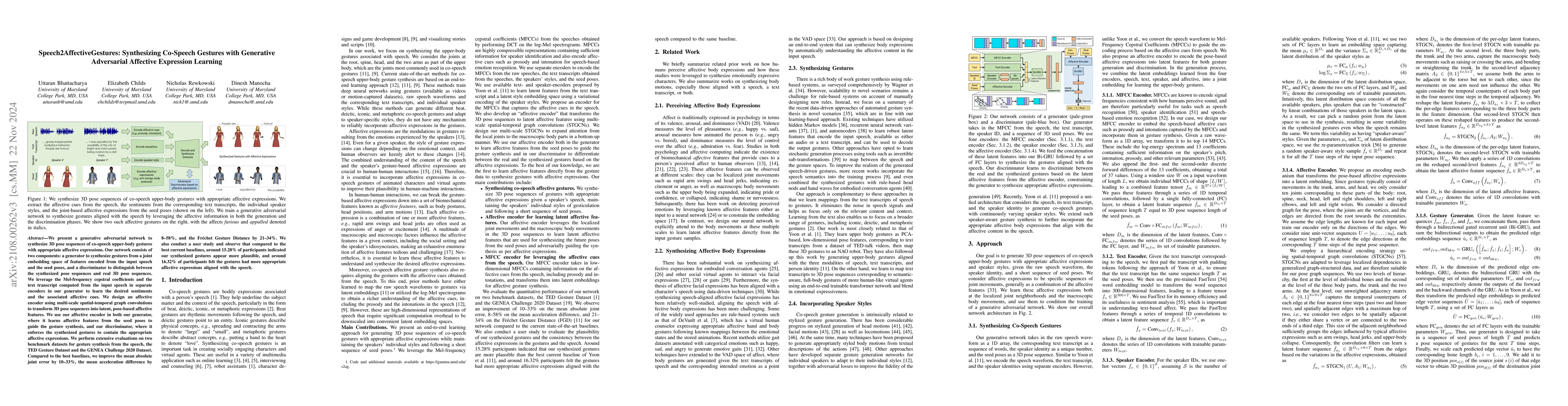 This paper presents a generative adversarial network to synthesize realistic 3D co-speech gestures with appropriate affective expressions, improving upon existing methods by 10-58% in various metrics. The network uses speech features and 3D pose sequences to generate gestures that align with the emotional content of the speech.