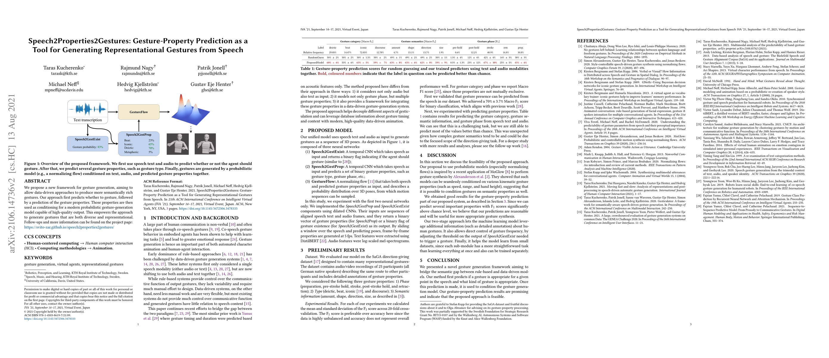 This paper introduces a framework for generating representational gestures from speech by first predicting whether to gesture and then predicting gesture properties, which are used to condition a probabilistic model for high-quality gesture generation, resulting in diverse and semantically rich outputs. Further details are available on the project page.