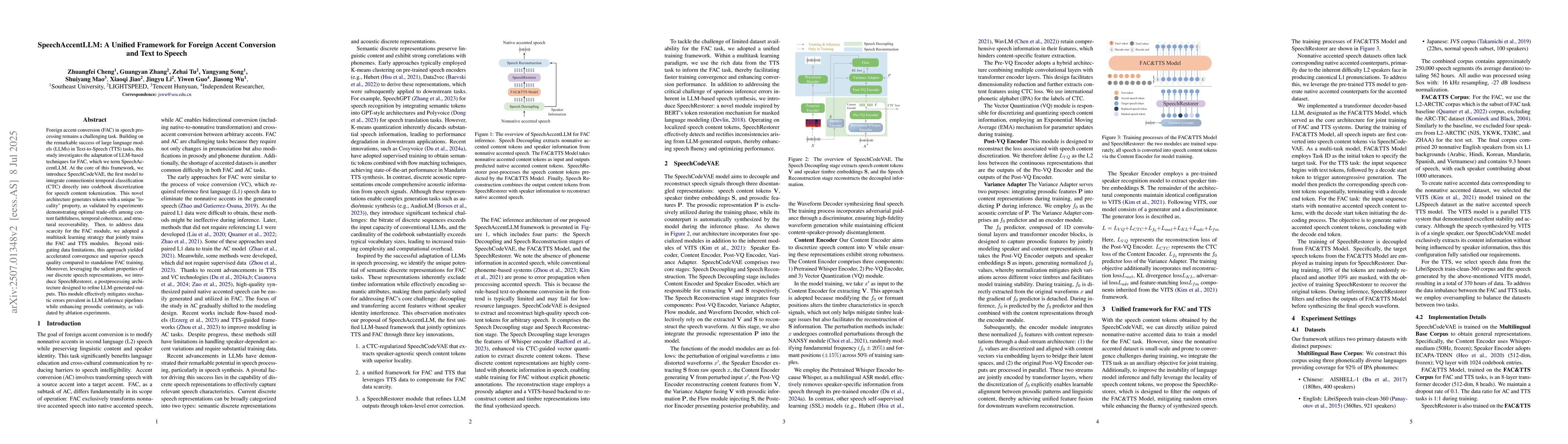 Foreign accent conversion (FAC) in speech processing remains a challenging task. Building on the remarkable success of large language models (LLMs) in Text-to-Speech (TTS) tasks, this study investigates the adaptation of LLM-based techniques for FAC, which we term SpeechAccentLLM. At the core of this framework, we introduce SpeechCodeVAE, the first model to integrate connectionist temporal classification (CTC) directly into codebook discretization for speech content tokenization. This novel architecture generates tokens with a unique "locality" property, as validated by experiments demonstrating optimal trade-offs among content faithfulness, temporal coherence, and structural recoverability. Then, to address data scarcity for the FAC module, we adopted a multitask learning strategy that jointly trains the FAC and TTS modules. Beyond mitigating data limitations, this approach yielded accelerated convergence and superior speech quality compared to standalone FAC training. Moreover, leveraging the salient properties of our discrete speech representations, we introduce SpeechRestorer, a postprocessing architecture designed to refine LLM-generated outputs. This module effectively mitigates stochastic errors prevalent in LLM inference pipelines while enhancing prosodic continuity, as validated by ablation experiments.
