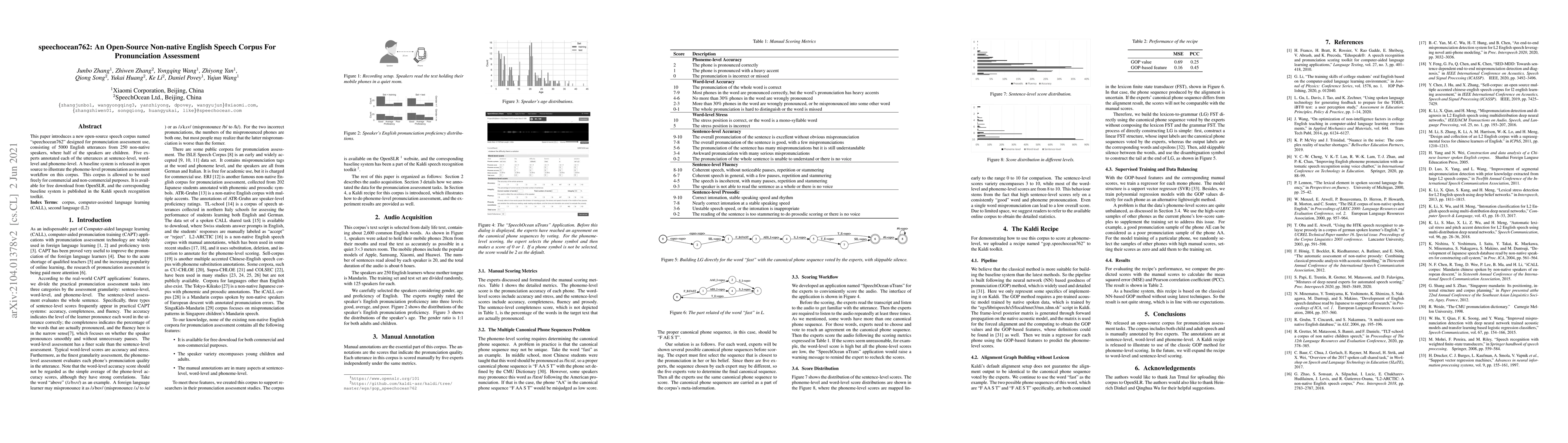 This paper introduces a new open-source speech corpus named "speechocean762" designed for pronunciation assessment use, consisting of 5000 English utterances from 250 non-native speakers, where half of the speakers are children. Five experts annotated each of the utterances at sentence-level, word-level and phoneme-level. A baseline system is released in open source to illustrate the phoneme-level pronunciation assessment workflow on this corpus. This corpus is allowed to be used freely for commercial and non-commercial purposes. It is available for free download from OpenSLR, and the corresponding baseline system is published in the Kaldi speech recognition toolkit.