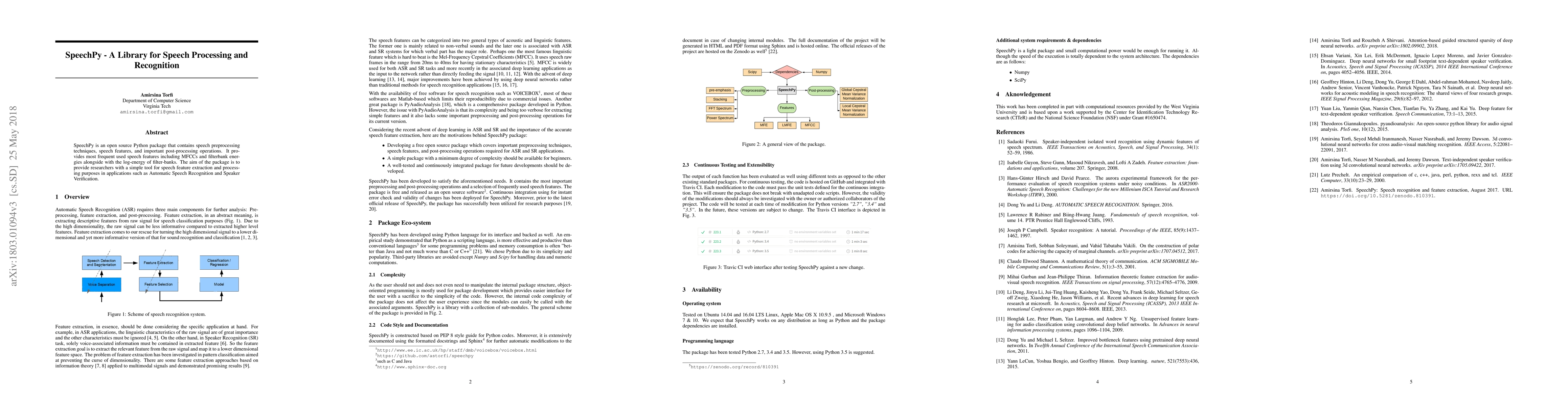 SpeechPy is an open source Python package that contains speech preprocessing techniques, speech features, and important post-processing operations. It provides most frequent used speech features including MFCCs and filterbank energies alongside with the log-energy of filter-banks. The aim of the package is to provide researchers with a simple tool for speech feature extraction and processing purposes in applications such as Automatic Speech Recognition and Speaker Verification.