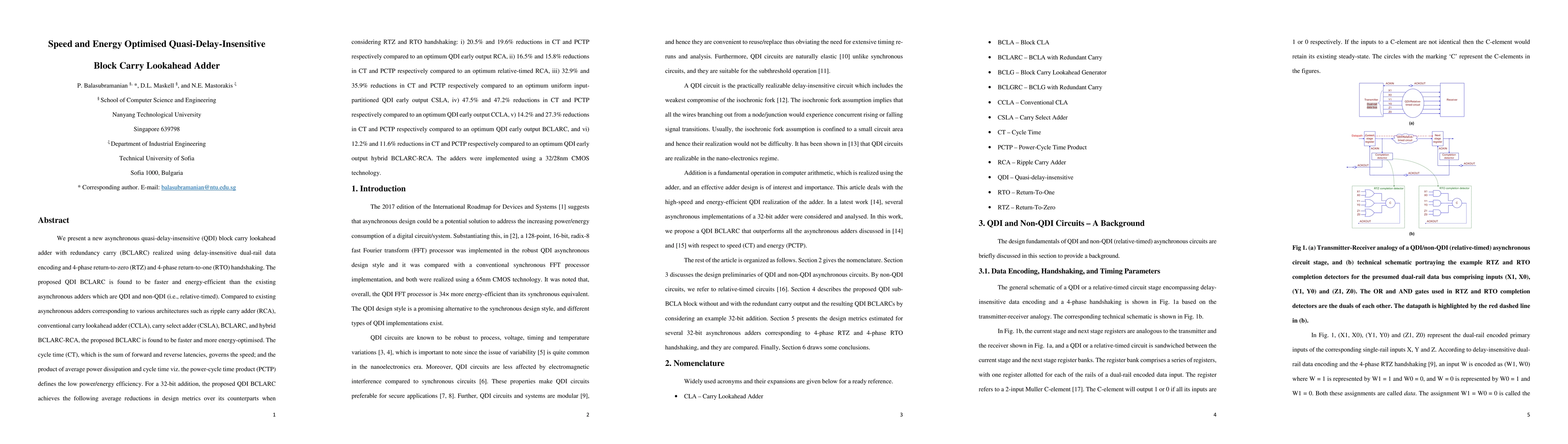 The paper introduces a novel asynchronous quasi-delay-insensitive block carry lookahead adder (QDI BCLARC) that is faster and more energy-efficient than existing asynchronous adders, achieving significant reductions in cycle time and power-cycle time product compared to various architectures. The proposed adder utilizes delay-insensitive dual-rail data encoding and 4-phase handshaking protocols for optimal performance.