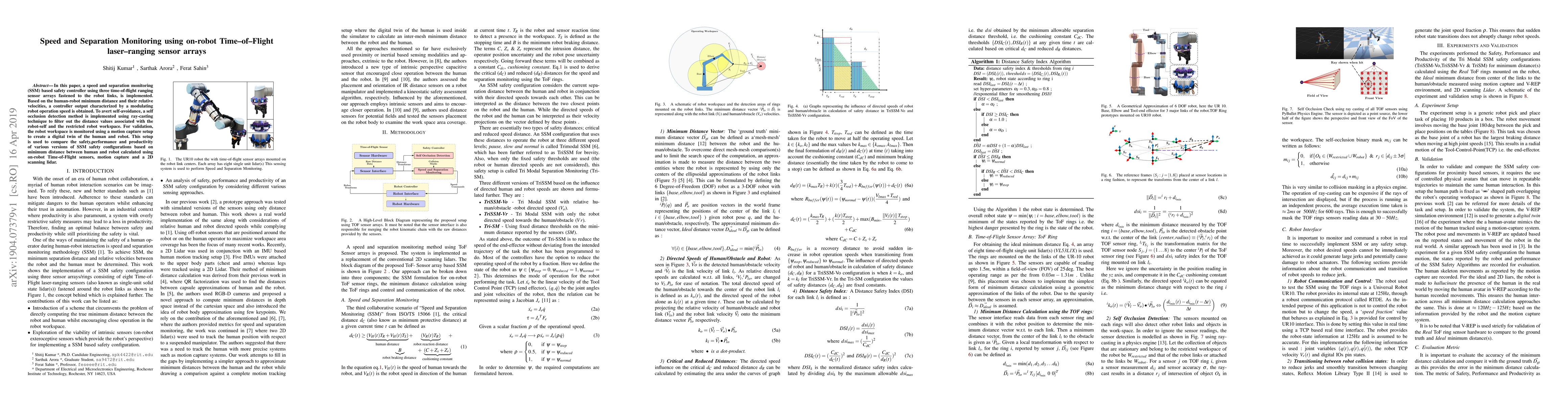 This paper implements a speed and separation monitoring (SSM) safety controller using on-robot Time-of-Flight laser sensors to maintain safe distances between humans and robots. The controller modulates robot speed based on human-robot proximity and relative velocities, and employs self-occlusion detection to avoid collisions.