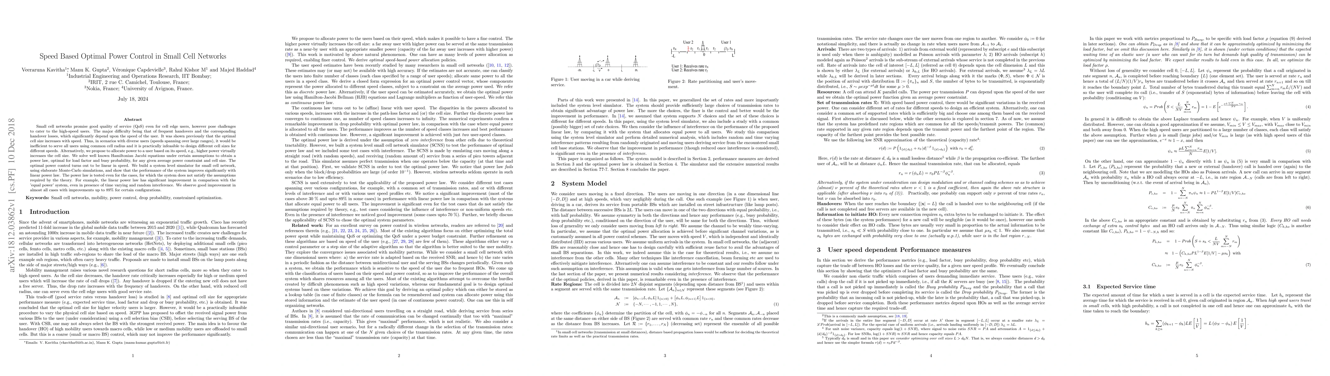 Small cell networks promise good quality of service (QoS) even for cell edge users, however pose challenges to cater to the high-speed users. The major difficulty being that of frequent handovers and the corresponding handover losses, which significantly depend upon the speed of the user. It was shown previously that the optimal cell size increases with speed. Thus, in scenarios with diverse users (speeds spanning over large ranges), it would be inefficient to serve all users using common cell radius and it is practically infeasible to design different cell sizes for different speeds. Alternatively, we propose to allocate power to a user based on its speed, e.g., higher power virtually increases the cell size. We solve well known Hamiltonian Jacobi equations under certain assumptions to obtain a power law, optimal for load factor and busy probability, for any given average power constraint and cell size. The optimal power control turns out to be linear in speed. We build a system level simulator for small cell network, using elaborate Monte-Carlo simulations, and show that the performance of the system improves significantly with linear power law. The power law is tested even for the cases, for which the system does not satisfy the assumptions required by the theory. For example, the linear power law has significant improvement in comparison with the 'equal power' system, even in presence of time varying and random interference. We observe good improvement in almost all cases with improvements up to 89\% for certain configurations.
