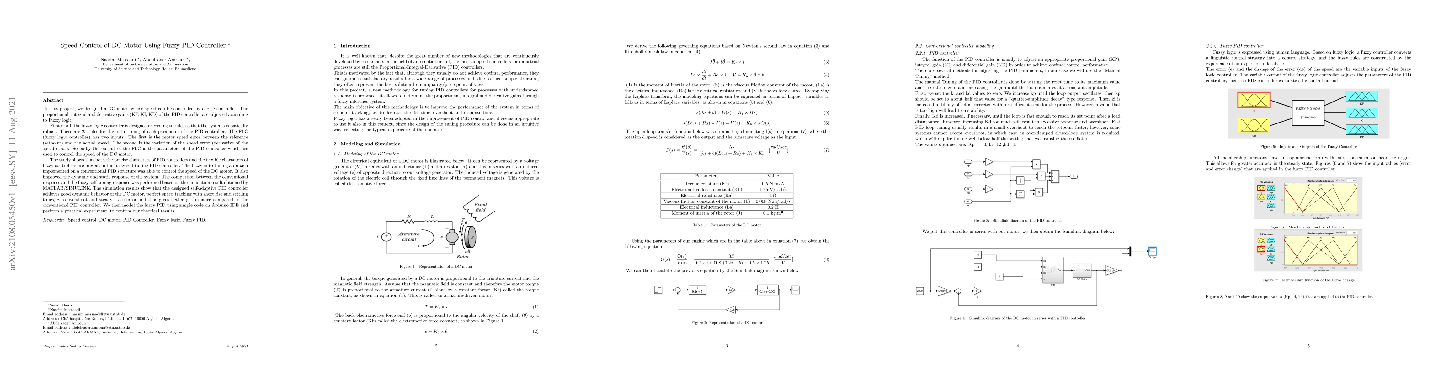 This research develops a DC motor speed control system using a fuzzy PID controller that adjusts PID gains based on fuzzy logic rules. The fuzzy logic controller improves the dynamic and static response of the motor, achieving precise speed tracking with minimal overshoot and settling time, as demonstrated through simulation and practical experiments.