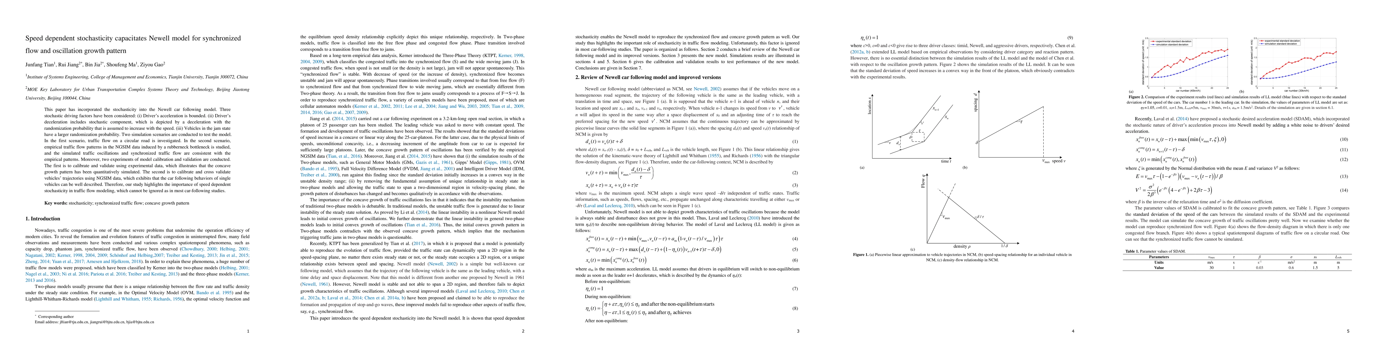 This paper has incorporated the stochasticity into the Newell car following model. Three stochastic driving factors have been considered: (i) Driver's acceleration is bounded. (ii) Driver's deceleration includes stochastic component, which is depicted by a deceleration with the randomization probability that is assumed to increase with the speed. (iii) Vehicles in the jam state have a larger randomization probability. Two simulation scenarios are conducted to test the model. In the first scenario, traffic flow on a circular road is investigated. In the second scenario, empirical traffic flow patterns in the NGSIM data induced by a rubberneck bottleneck is studied, and the simulated traffic oscillations and synchronized traffic flow are consistent with the empirical patterns. Moreover, two experiments of model calibration and validation are conducted. The first is to calibrate and validate using experimental data, which illustrates that the concave growth pattern has been quantitatively simulated. The second is to calibrate and cross validate vehicles' trajectories using NGSIM data, which exhibits that the car following behaviors of single vehicles can be well described. Therefore, our study highlights the importance of speed dependent stochasticity in traffic flow modeling, which cannot be ignored as in most car-following studies.