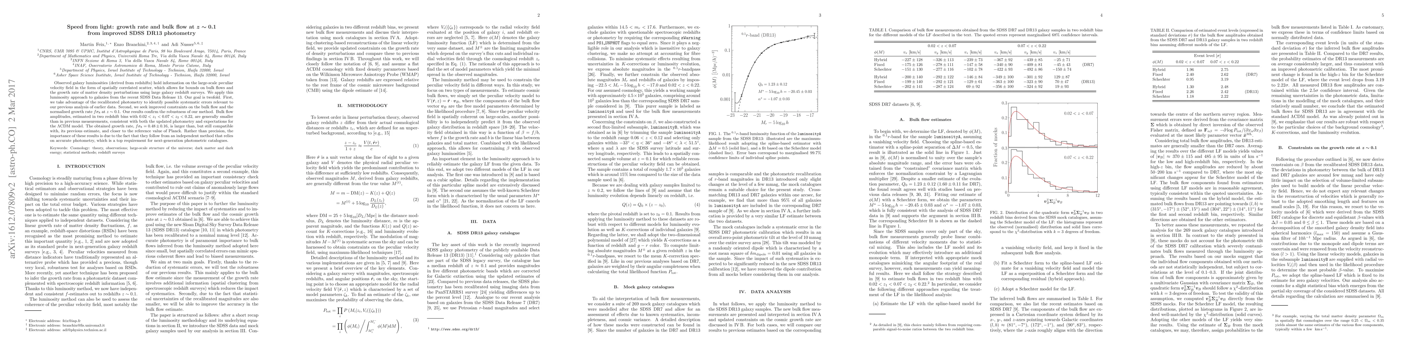 Observed galaxy luminosities (derived from redshifts) hold information on the large-scale peculiar velocity field in the form of spatially correlated scatter, which allows for bounds on bulk flows and the growth rate of matter density perturbations using large galaxy redshift surveys. We apply this luminosity approach to galaxies from the recent SDSS Data Release 13. Our goal is twofold. First, we take advantage of the recalibrated photometry to identify possible systematic errors relevant to our previous analysis of earlier data. Second, we seek improved constraints on the bulk flow and the normalized growth rate f$\sigma_{8}$ at z ~ 0.1. Our results confirm the robustness of our method. Bulk flow amplitudes, estimated in two redshift bins with 0.02 < z$_{1}$ < 0.07 < z$_{2}$ < 0.22, are generally smaller than in previous measurements, consistent with both the updated photometry and expectations for the $\Lambda$CDM model. The obtained growth rate, f$\sigma_{8}$ = 0.48 +/- 0.16, is larger than, but still compatible with, its previous estimate, and closer to the reference value of Planck. Rather than precision, the importance of these results is due to the fact that they follow from an independent method that relies on accurate photometry, which is a top requirement for next-generation photometric catalogs.