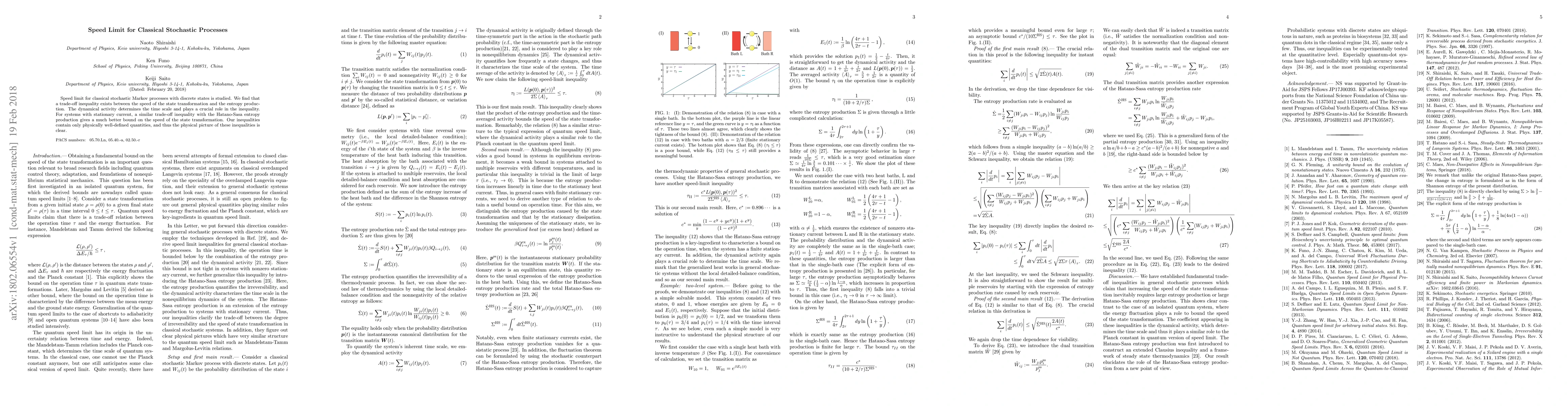 This paper investigates the speed limit for classical stochastic Markov processes, revealing a trade-off inequality between the rate of state transformation and entropy production, with dynamical activity determining the time scale. For systems with stationary current, a refined trade-off inequality with the Hatano-Sasa entropy production provides a tighter bound on state transformation speed.