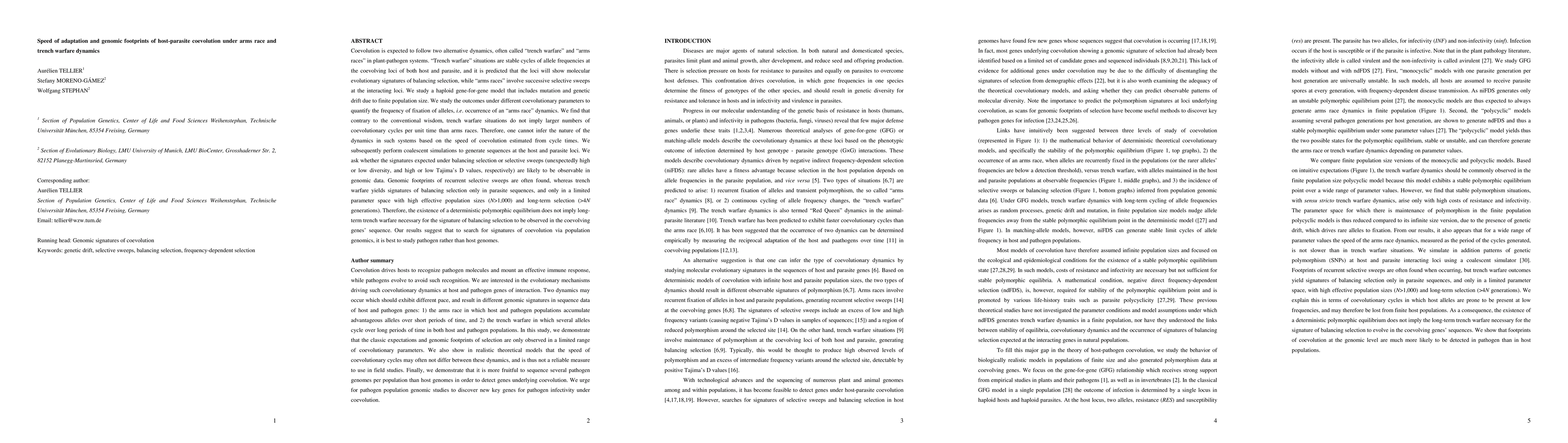 Coevolution is expected to follow two alternative dynamics, often called trench warfare and arms races in plant-pathogen systems. Trench warfare situations are stable cycles of allele frequencies at the coevolving loci of both host and parasite, and it is predicted that the loci will show molecular evolutionary signatures of balancing selection, while arms races involve successive selective sweeps at the interacting loci. We study a haploid gene-for-gene model that includes mutation and genetic drift due to finite population size. We study the outcomes under different coevolutionary parameters to quantify the frequency of fixation of alleles, i.e. occurrence of an arms race dynamics. We find that contrary to the conventional wisdom, trench warfare situations do not imply larger numbers of coevolutionary cycles per unit time than arms races. Therefore, one cannot infer the nature of the dynamics in such systems based on the speed of coevolution estimated from cycle times. We subsequently perform coalescent simulations to generate sequences at the host and parasite loci. We ask whether the signatures expected under balancing selection or selective sweeps (unexpectedly high or low diversity, and high or low Tajima D values, respectively) are likely to be observable in genomic data. Genomic footprints of recurrent selective sweeps are often found, whereas trench warfare yields signatures of balancing selection only in parasite sequences, and only in a limited parameter space with high effective population sizes and long-term selection. Therefore, the existence of a deterministic polymorphic equilibrium does not imply long-term trench warfare necessary for the signature of balancing selection to be observed in the coevolving genes sequence. Our results suggest that to search for signatures of coevolution via population genomics, it is best to study pathogen rather than host genomes.