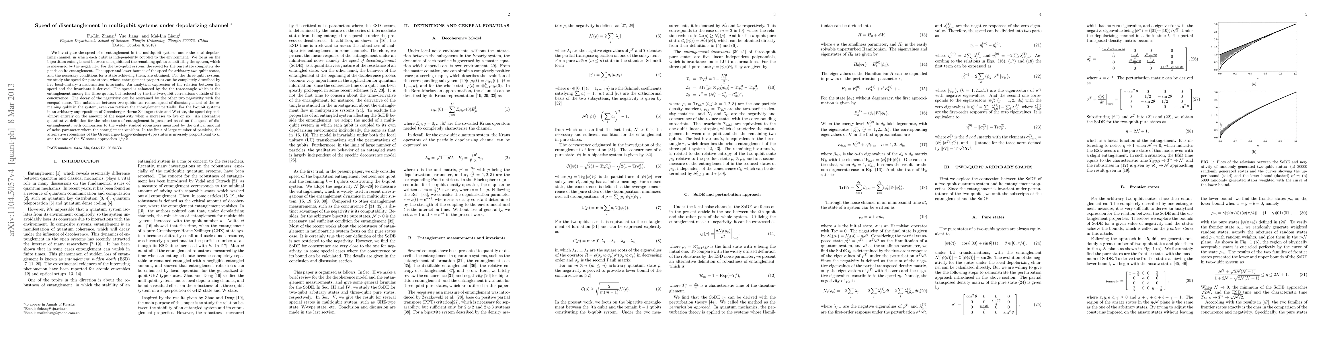 This paper investigates the speed of disentanglement in multi-qubit systems under local depolarizing channels, focusing on the negativity as a measure of bipartition entanglement. It finds that the disentanglement speed varies with the entanglement type and amount, with the three-tangle enhancing and two-qubit correlations reducing it, and proposes an alternative robustness measure based on disentanglement speed.