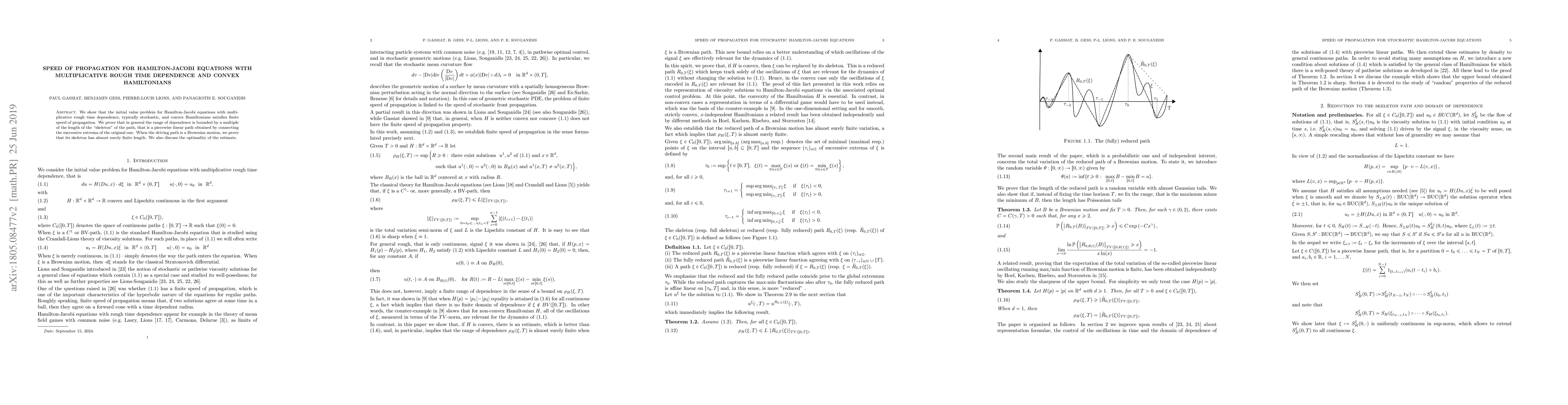 This paper demonstrates finite speed of propagation for Hamilton-Jacobi equations with multiplicative rough time dependence and convex Hamiltonians, showing that the range of dependence is bounded by a multiple of the length of the path's "skeleton." For Brownian motion, it proves the skeleton has almost surely finite length, and discusses the optimality of the derived estimate.