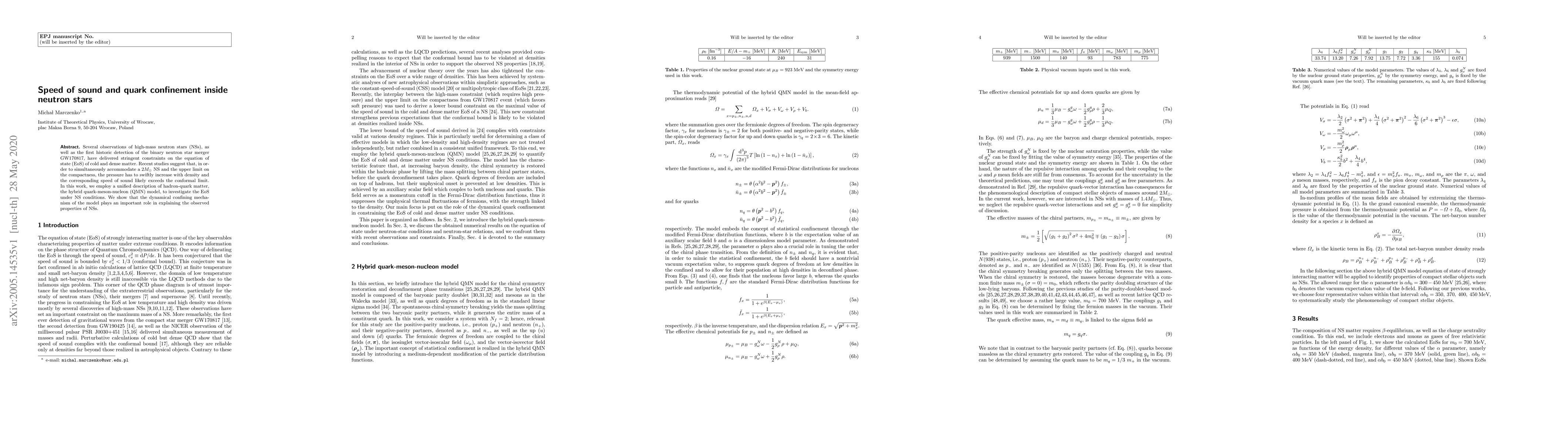 Several observations of high-mass neutron stars (NSs), as well as the first historic detection of the binary neutron star merger GW170817, have delivered stringent constraints on the equation of state (EoS) of cold and dense matter. Recent studies suggest that, in order to simultaneously accommodate a $2M_\odot$ NS and the upper limit on the compactness, the pressure has to swiftly increase with density and the corresponding speed of sound likely exceeds the conformal limit. In this work, we employ a unified description of hadron-quark matter, the hybrid quark-meson-nucleon (QMN) model, to investigate the EoS under NS conditions. We show that the dynamical confining mechanism of the model plays an important role in explaining the observed properties of NSs.