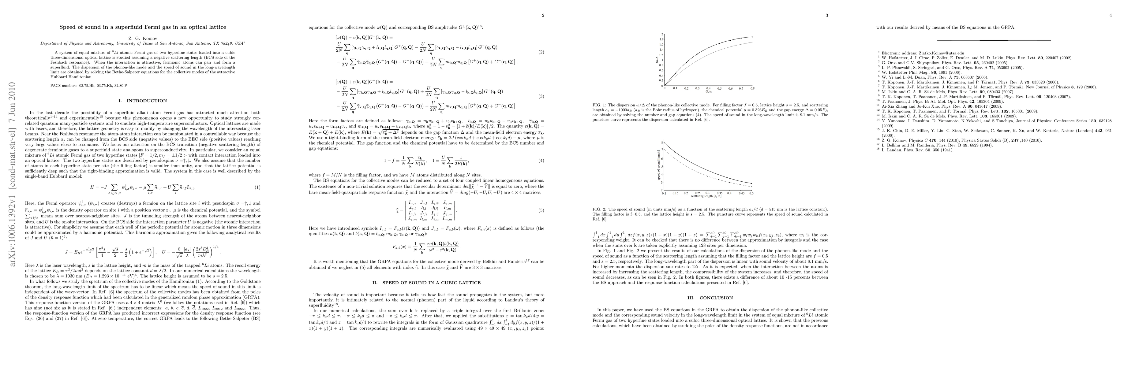 This research investigates the speed of sound in a superfluid Fermi gas of $^6Li$ atoms in an optical lattice, revealing phonon-like modes and calculating the speed of sound using Bethe-Salpeter equations for the attractive interaction regime. The study focuses on the long-wavelength limit of the collective modes.