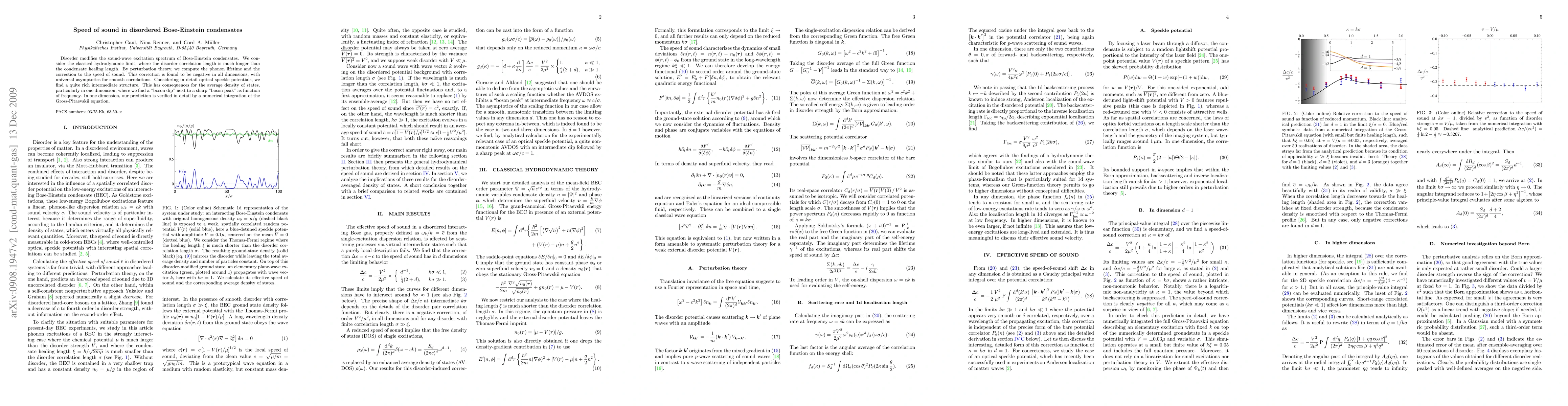 This paper investigates how disorder affects the speed of sound in Bose-Einstein condensates, finding a negative correction to the speed of sound in all dimensions due to phonon lifetime changes. The study reveals a "boson dip" and "boson peak" in one dimension, verified by numerical integration of the Gross-Pitaevskii equation.