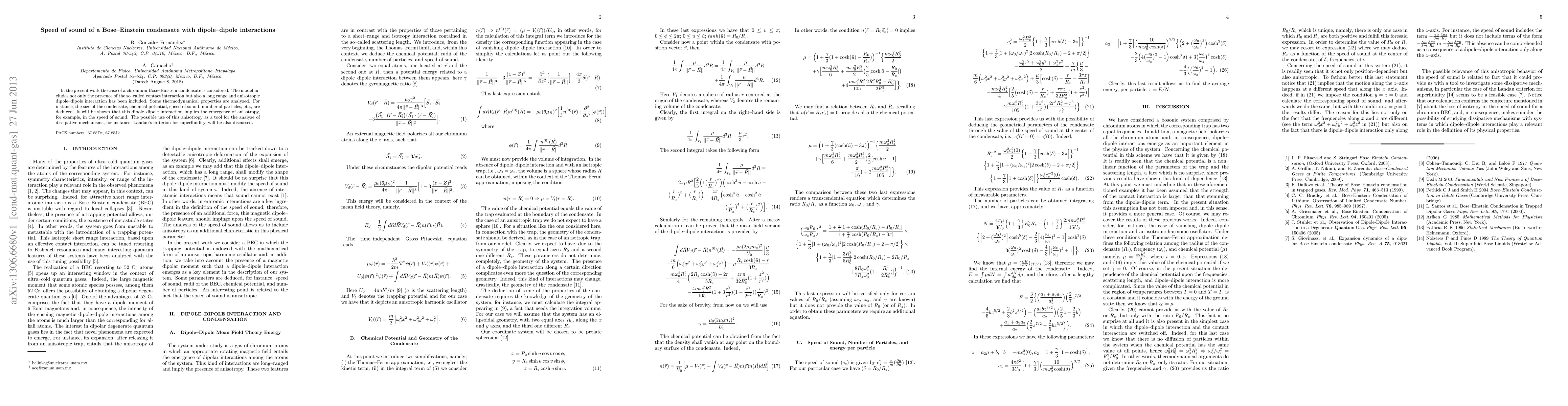 In the present work the case of a chromium Bose-Einstein condensate is considered. The model includes not only the presence of the so-called contact interaction but also a long range and anisotropic dipole-dipole interaction has been included. Some thermodynamical properties are analyzed. For instance, the size of the condensate, chemical potential, speed of sound, number of particles, etc., are deduced. It will be shown that this dipole-dipole interaction implies the emergence of anisotropy, for example, in the speed of sound. The possible use of this anisotropy as a tool for the analyze of dissipative mechanisms, for instance, Landau's criterion for superfluidity, will be also discussed.