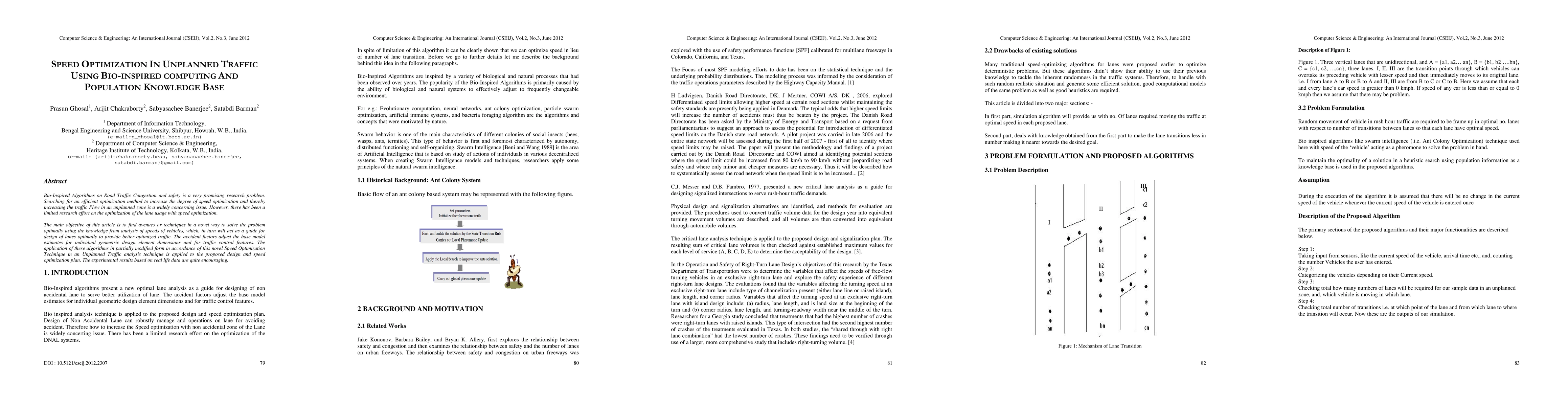 Bio-Inspired Algorithms on Road Traffic Congestion and safety is a very promising research problem. Searching for an efficient optimization method to increase the degree of speed optimization and thereby increasing the traffic Flow in an unplanned zone is a widely concerning issue. However, there has been a limited research effort on the optimization of the lane usage with speed optimization. The main objective of this article is to find avenues or techniques in a novel way to solve the problem optimally using the knowledge from analysis of speeds of vehicles, which, in turn will act as a guide for design of lanes optimally to provide better optimized traffic. The accident factors adjust the base model estimates for individual geometric design element dimensions and for traffic control features. The application of these algorithms in partially modified form in accordance of this novel Speed Optimization Technique in an Unplanned Traffic analysis technique is applied to the proposed design and speed optimization plan. The experimental results based on real life data are quite encouraging.