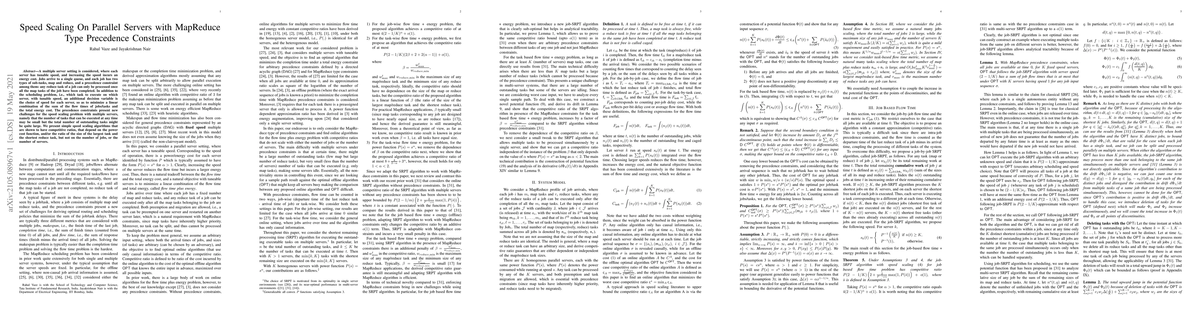 This paper explores scheduling and speed scaling strategies for parallel servers handling MapReduce tasks with precedence constraints, aiming to minimize job flow times and energy costs. It introduces algorithms with competitive ratios that are independent of the number of jobs or servers, addressing the complexity introduced by task precedence.