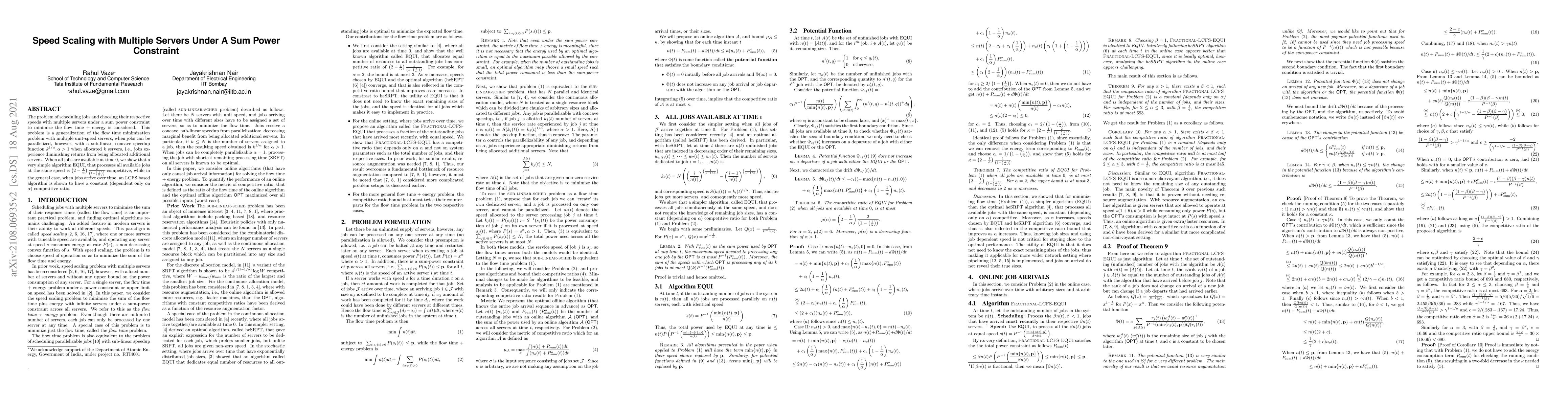 A new algorithm named EQUI is shown to be competitive in minimizing flow time + energy when allocating jobs to multiple servers under a sum power constraint. The paper also introduces an LCFS-based algorithm that achieves constant competitiveness in the general case of job arrivals over time.