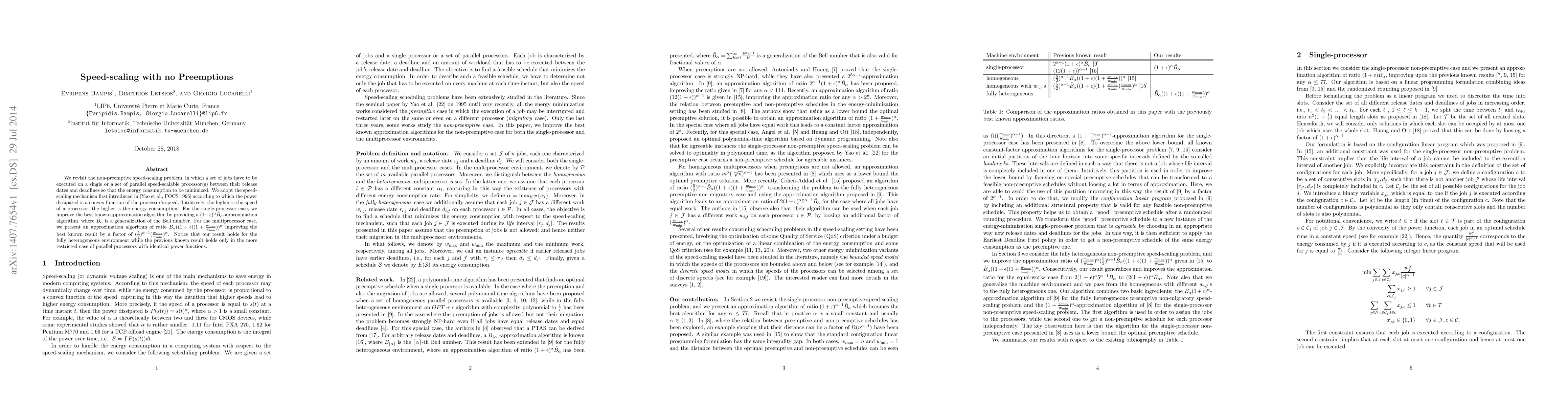 We revisit the non-preemptive speed-scaling problem, in which a set of jobs have to be executed on a single or a set of parallel speed-scalable processor(s) between their release dates and deadlines so that the energy consumption to be minimized. We adopt the speed-scaling mechanism first introduced in [Yao et al., FOCS 1995] according to which the power dissipated is a convex function of the processor's speed. Intuitively, the higher is the speed of a processor, the higher is the energy consumption. For the single-processor case, we improve the best known approximation algorithm by providing a $(1+\epsilon)^{\alpha}\tilde{B}_{\alpha}$-approximation algorithm, where $\tilde{B}_{\alpha}$ is a generalization of the Bell number. For the multiprocessor case, we present an approximation algorithm of ratio $\tilde{B}_{\alpha}((1+\epsilon)(1+\frac{w_{\max}}{w_{\min}}))^{\alpha}$ improving the best known result by a factor of $(\frac{5}{2})^{\alpha-1}(\frac{w_{\max}}{w_{\min}})^{\alpha}$. Notice that our result holds for the fully heterogeneous environment while the previous known result holds only in the more restricted case of parallel processors with identical power functions.