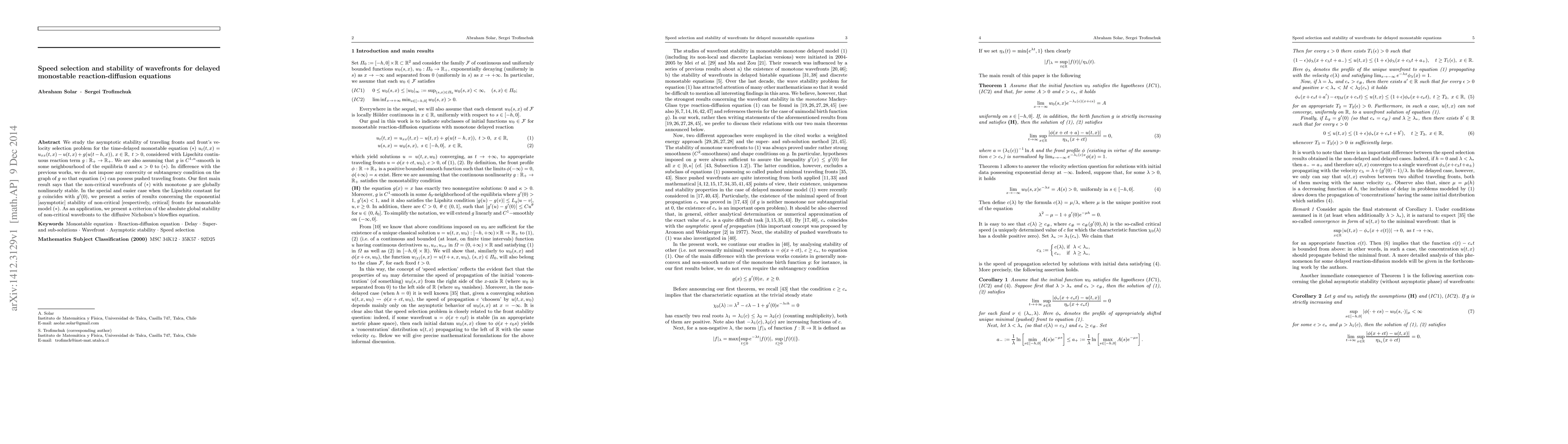 We study the asymptotic stability of traveling fronts and front's velocity selection problem for the time-delayed monostable equation $(*)$ $u_{t}(t,x) = u_{xx}(t,x) - u(t,x) + g(u(t-h,x)),\ x \in \mathbb{R},\ t >0$, considered with Lipschitz continuous reaction term $g: \mathbb{R}_+ \to \mathbb{R}_+$. We are also assuming that $g$ is $C^{1,\alpha}$-smooth in some neighbourhood of the equilibria $0$ and $\kappa >0$ to $(*)$. In difference with the previous works, we do not impose any convexity or subtangency condition on the graph of $g$ so that equation $(*)$ can possess pushed traveling fronts. Our first main result says that the non-critical wavefronts of $(*)$ with monotone $g$ are globally nonlinearly stable. In the special and easier case when the Lipschitz constant for $g$ coincides with $g'(0)$, we present a series of results concerning the exponential [asymptotic] stability of non-critical [respectively, critical] fronts for the monostable model $(*)$. As an application, we present a criterion of the absolute global stability of non-critical wavefronts to the diffusive Nicholson's blowflies equation.