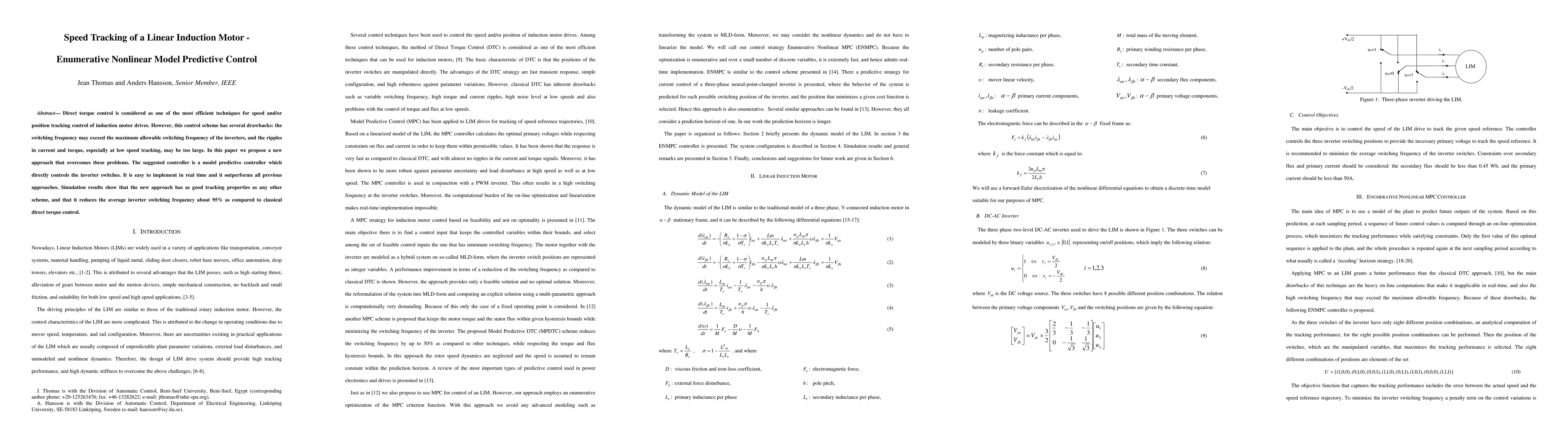This paper proposes a model predictive controller for a linear induction motor to improve speed tracking efficiency, addressing issues like excessive switching frequency and current ripples. It demonstrates a 95% reduction in average inverter switching frequency compared to classical direct torque control, maintaining good tracking performance.