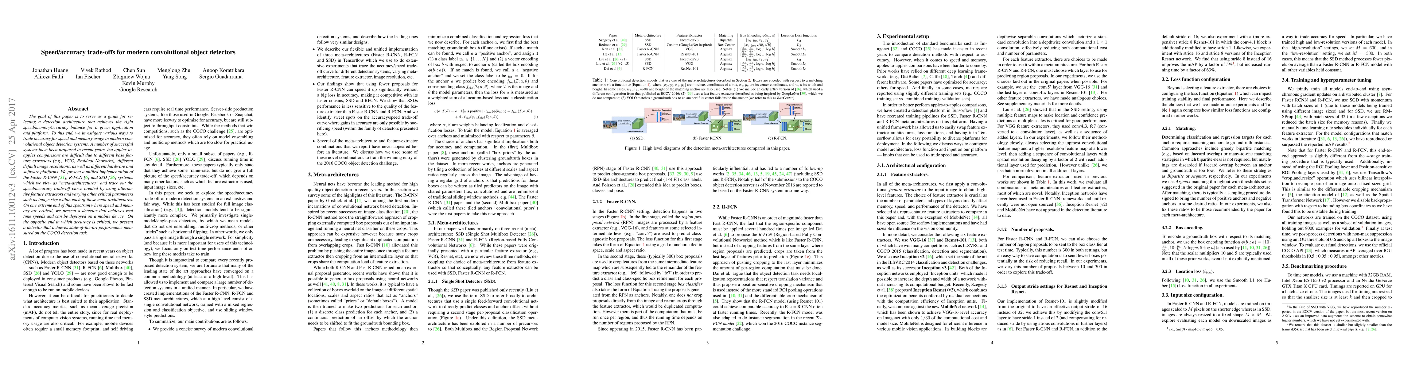 This paper investigates various convolutional object detectors to determine the optimal balance between speed, memory usage, and accuracy for different applications. It compares Faster R-CNN, R-FCN, and SSD architectures, demonstrating how trade-offs can be made using different feature extractors and parameters, ranging from real-time mobile-friendly detectors to high-accuracy models for COCO tasks.