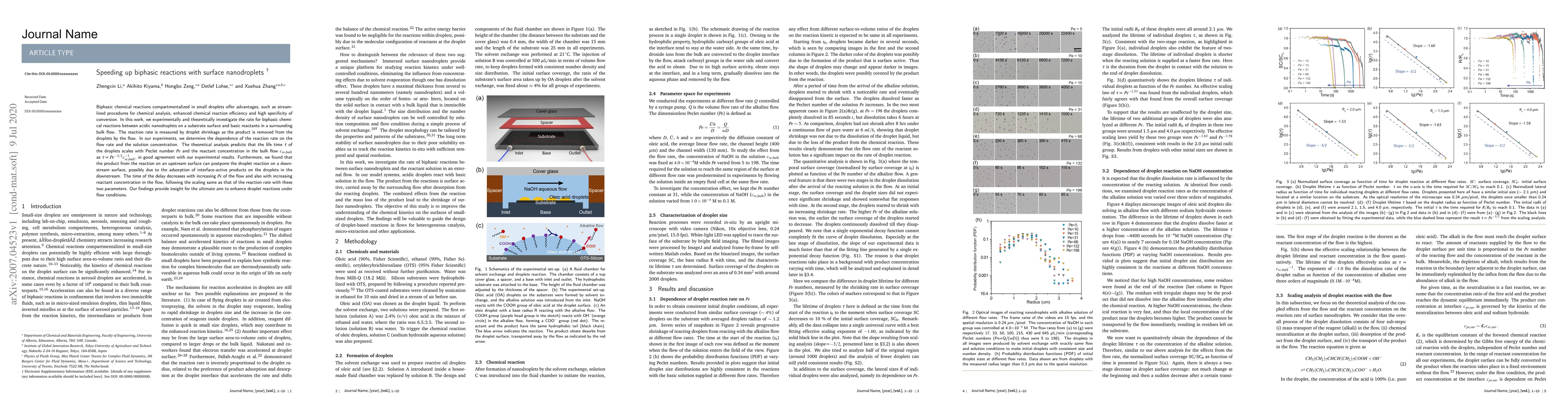 This paper investigates the enhancement of biphasic chemical reactions in nanodroplets on a substrate surface, finding that reaction rates depend on flow rate and reactant concentration. Theoretical and experimental results show a scaling relationship between droplet lifetime and these parameters, providing insights for optimizing reaction efficiency.