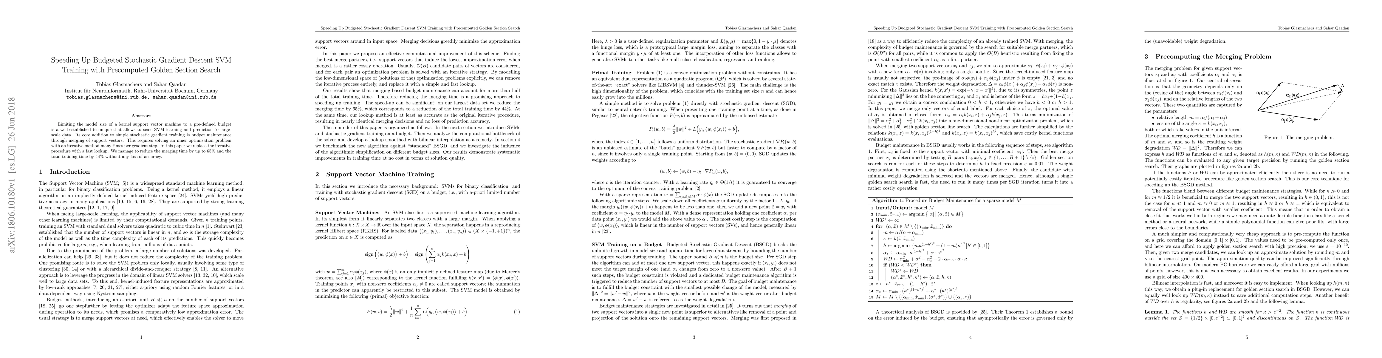 This paper proposes a method to accelerate budgeted stochastic gradient descent training for SVMs by replacing iterative optimization with precomputed golden section search, achieving up to a 65% reduction in merging time and a 44% reduction in total training time without compromising accuracy.