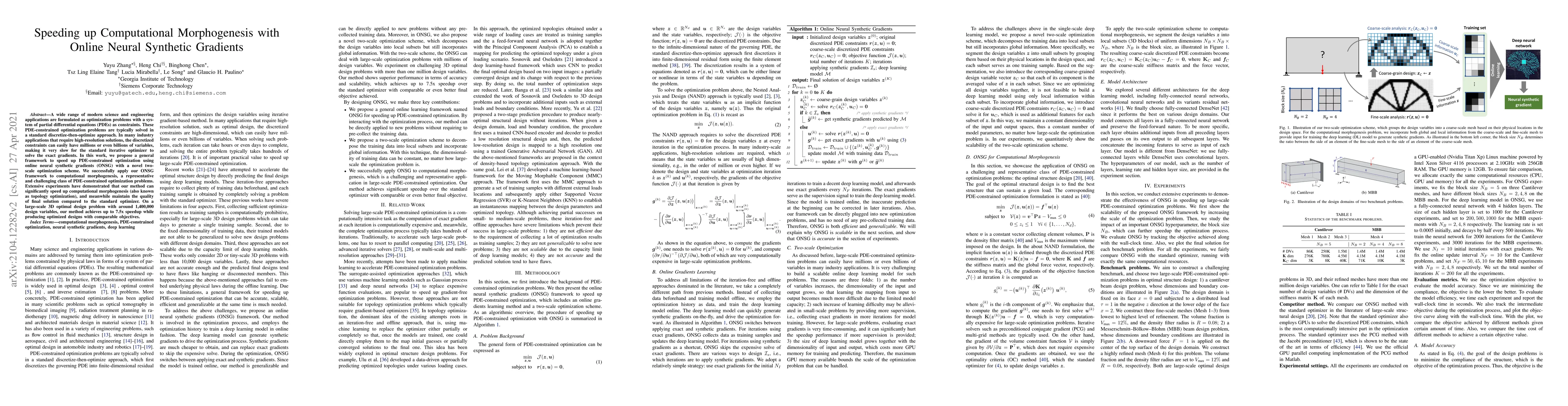 This paper proposes a framework using online neural synthetic gradients (ONSG) to accelerate PDE-constrained optimization, specifically for computational morphogenesis. The method achieves significant speedups, up to 7.5x, while maintaining solution quality compared to traditional optimizers.