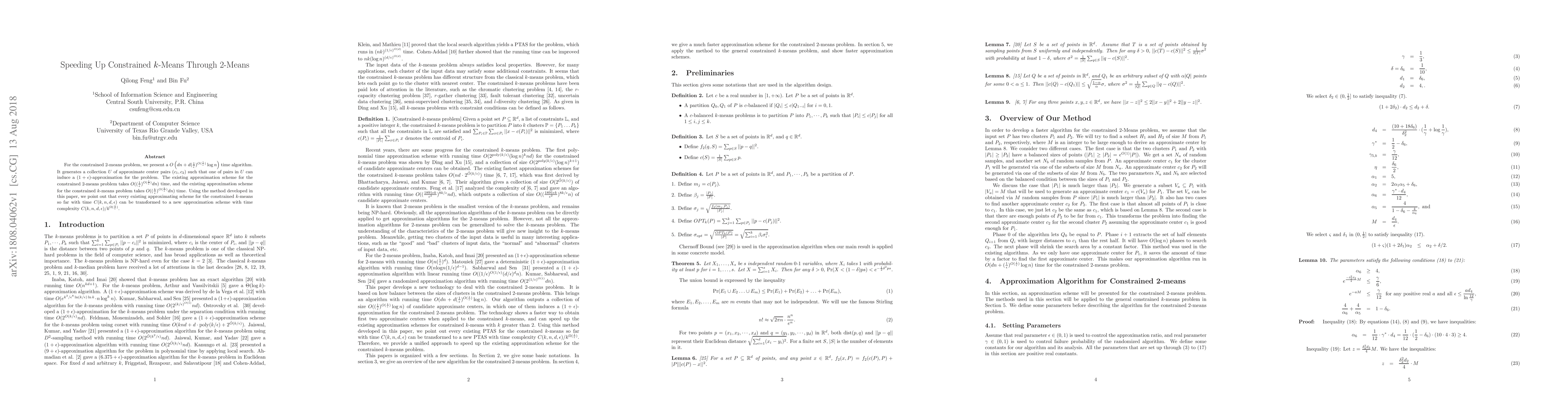 For the constrained 2-means problem, we present a $O\left(dn+d({1\over\epsilon})^{O({1\over \epsilon})}\log n\right)$ time algorithm. It generates a collection $U$ of approximate center pairs $(c_1, c_2)$ such that one of pairs in $U$ can induce a $(1+\epsilon)$-approximation for the problem. The existing approximation scheme for the constrained 2-means problem takes $O(({1\over\epsilon})^{O({1\over \epsilon})}dn)$ time, and the existing approximation scheme for the constrained $k$-means problem takes $O(({k\over\epsilon})^{O({k\over \epsilon})}dn)$ time. Using the method developed in this paper, we point out that every existing approximating scheme for the constrained $k$-means so far with time $C(k, n, d, \epsilon)$ can be transformed to a new approximation scheme with time complexity ${C(k, n, d, \epsilon)/ k^{\Omega({1\over\epsilon})}}$.